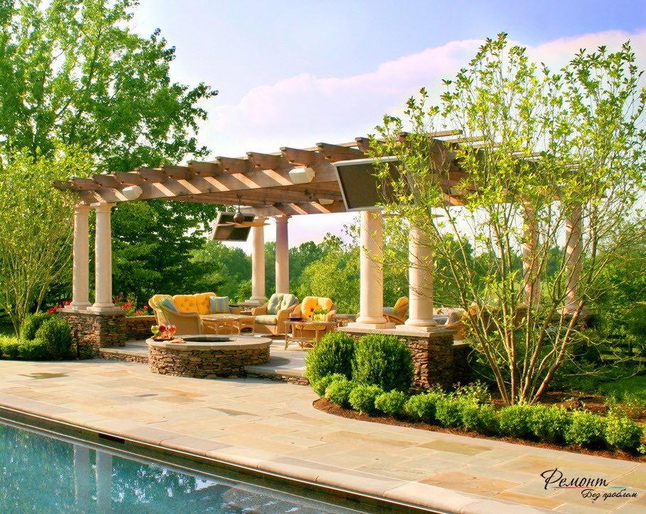 - Внешний вид навеса определяет то, как вы себя будете чувствовать под ним или даже рядом с ним. Если пергола сделана из тяжелых, объемных материалов, с колоннами и так далее, то ее массивность будет как бы подавлять. Здесь трудно будет посидеть спокойно и расслабиться. Такая конструкция больше подойдет для каких-либо хозяйственных пристроек, для проведения шумных вечеринок или для бассейна, особенно если окружающая атмосфера соответствующая – тоже массивная.