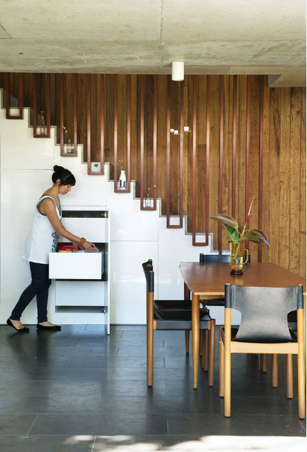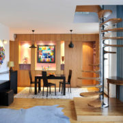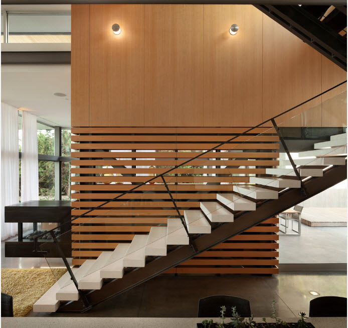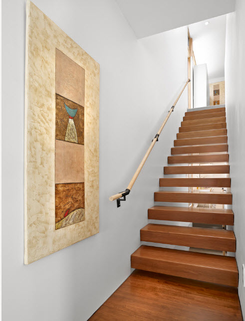 При создании полностью деревянной лестницы можно использовать комбинирование пород древесины с контрастным сочетанием цветовых природных решений. Но подобные конструкции могут обойтись недешево. Гораздо практичнее и доступнее по стоимости – комбинировать окрашенную и не окрашенную древесины. Как правило, если этот прием используется для опор и поручня перил, то и повторяется в ступенях лестницы.