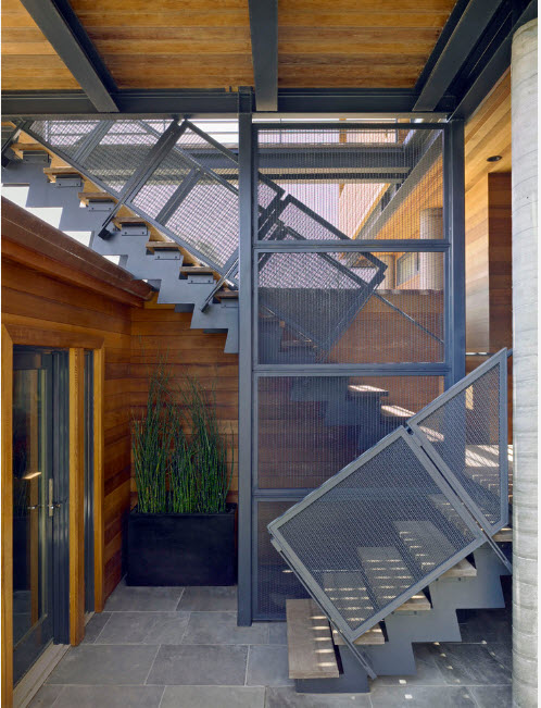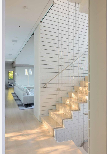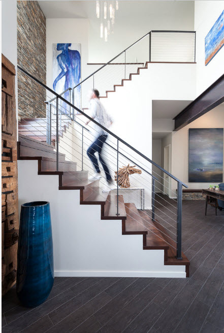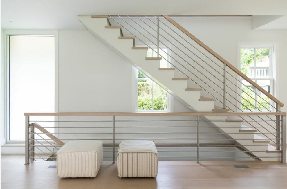 При создании комбинированных конструкций перил для лестниц очень часто используются так называемые металлические струны. Свое название элементы получили за малый диаметр, но высокую прочность. Струны создают надежную защиту для всех, кто перемещается по лестницы, но пи этом практически не перекрывают распространение солнечного света. За эти качества дизайнеры рекомендуют использование металлических струн (тонких канатов) как в просторных помещениях, так и в малогабаритных пространствах.