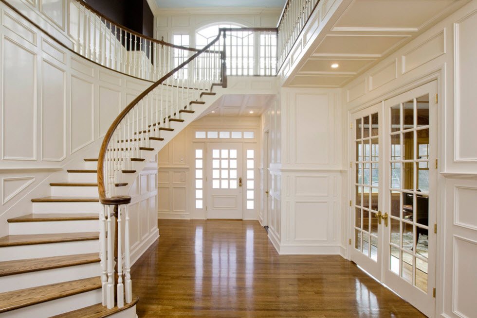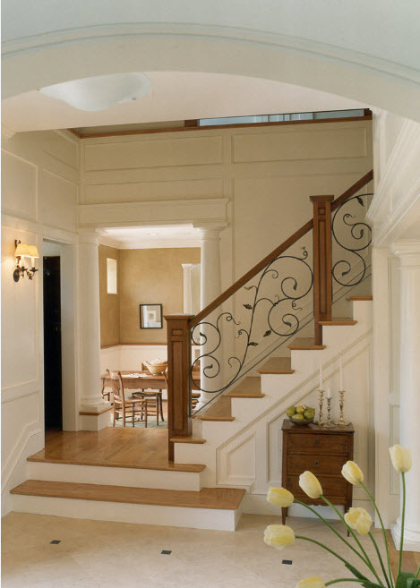 В случае если лестница с двух сторон ограничена стенами, то необходимость в перилах отпадает. Но для комфортного и безопасного перемещения по ступеням лестницы ее необходимо оснастить поручнем, который можно монтировать непосредственно к стене. В большинстве случаев такой поручень выполняется из дерева (даже, если сама лестница выполнена из другого материала), ведь до него так приятно дотрагиваться.