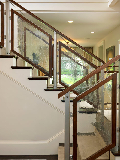 В некоторых случаях успешным является комбинирование трех основных материалов, используемых для изготовления перил – металла, дерева и стекла. Такие сооружения обойдутся недешево, но могут стать практичным и надежным украшением лестницы. Как правило, из стекла выполняются защитные экраны, которые крепятся к металлическим стойкам, конструкцию завершают деревянные перила.