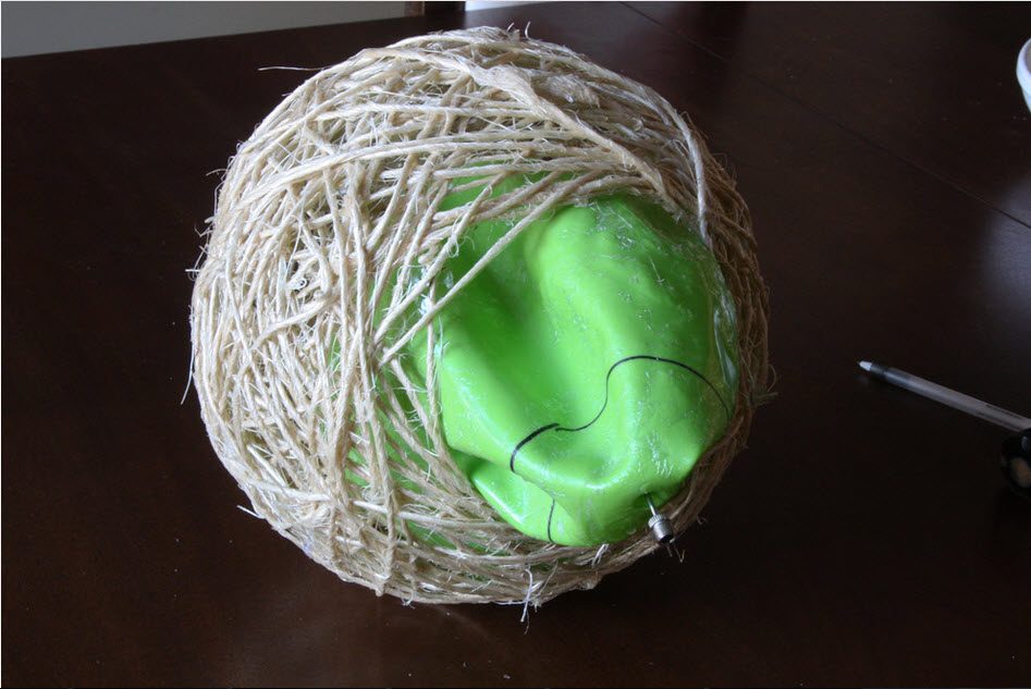 Шаг 2: Тщательно пропитайте веревку клеем. Хаотично в разных направлениях намотайте ее на шар, чтобы получились красивые переплеты. При этом оставьте свободным место, очерченное маркером. Ни в коем случае не обматывайте шар полностью – стеклянная поверхность должна просматриваться, иначе свет никак не сможет пробиться сквозь глухое плетение. Обмотанные таким образом шары оставьте сушиться на несколько дней.Чтобы сделать такой колоритный и необычный светильник, вам понадобятся: