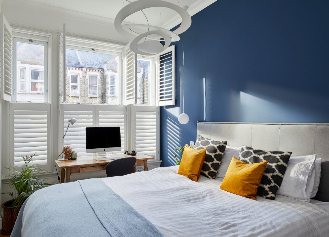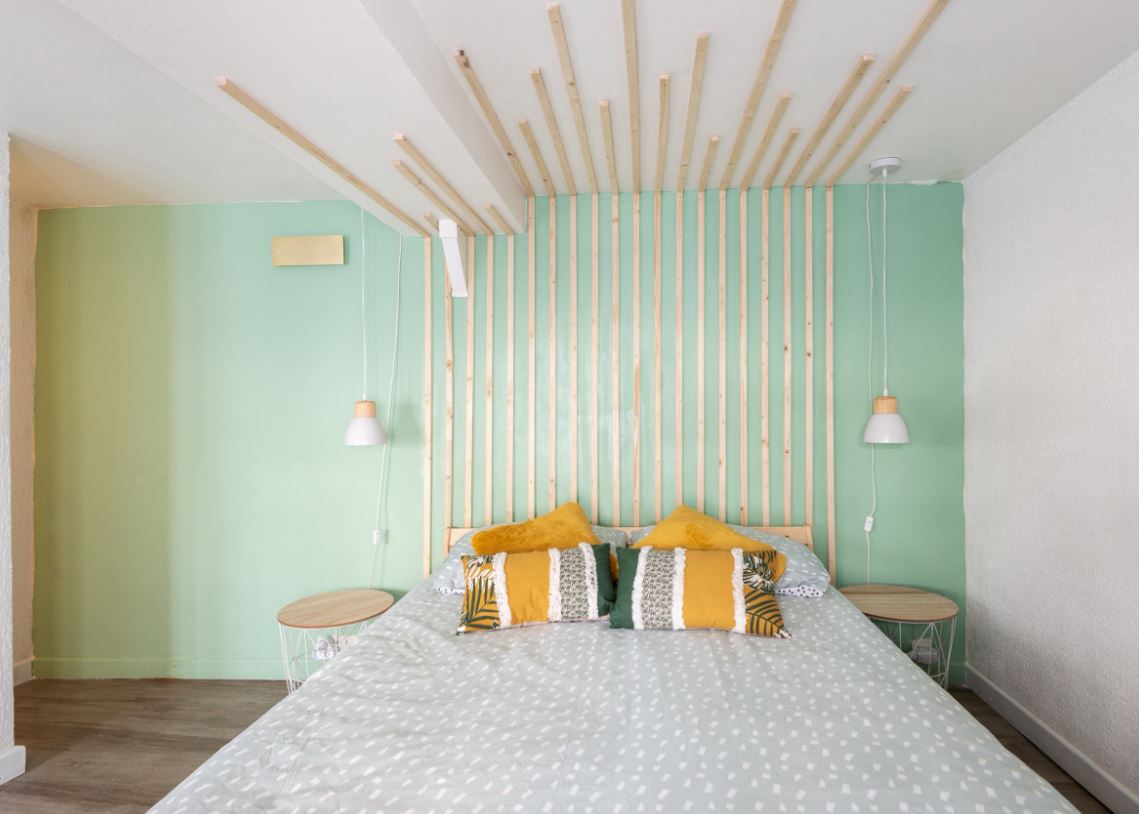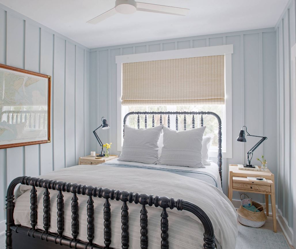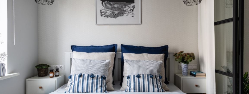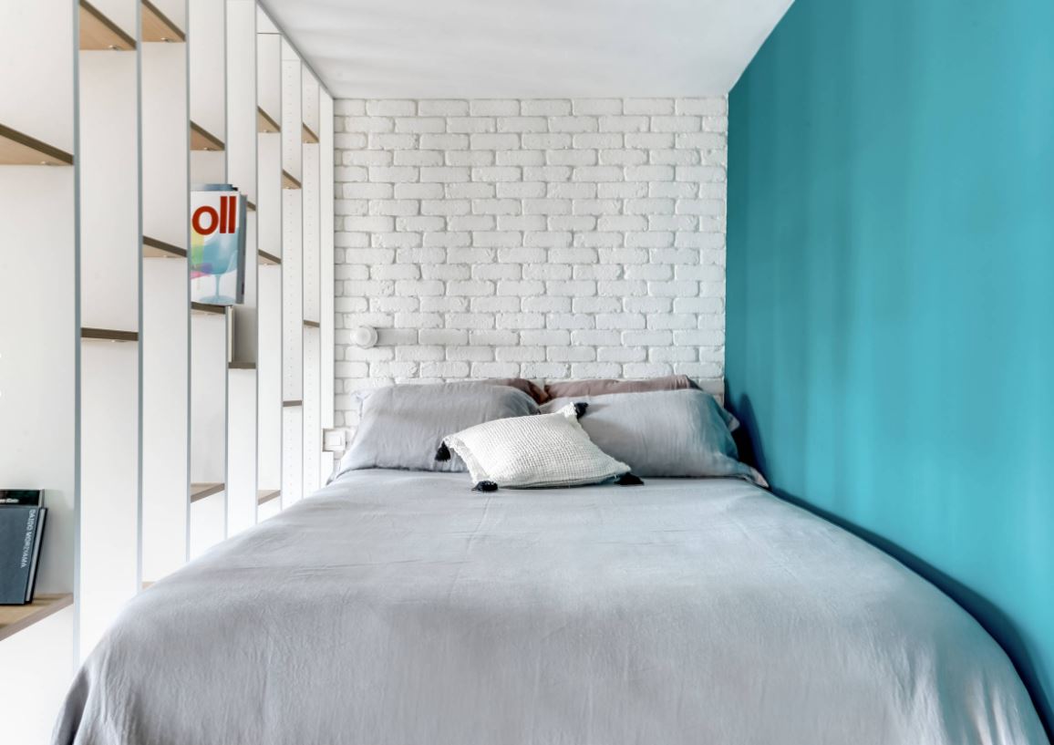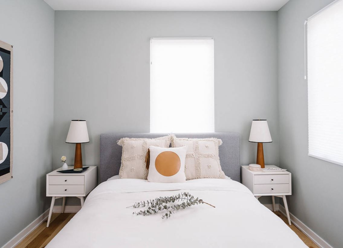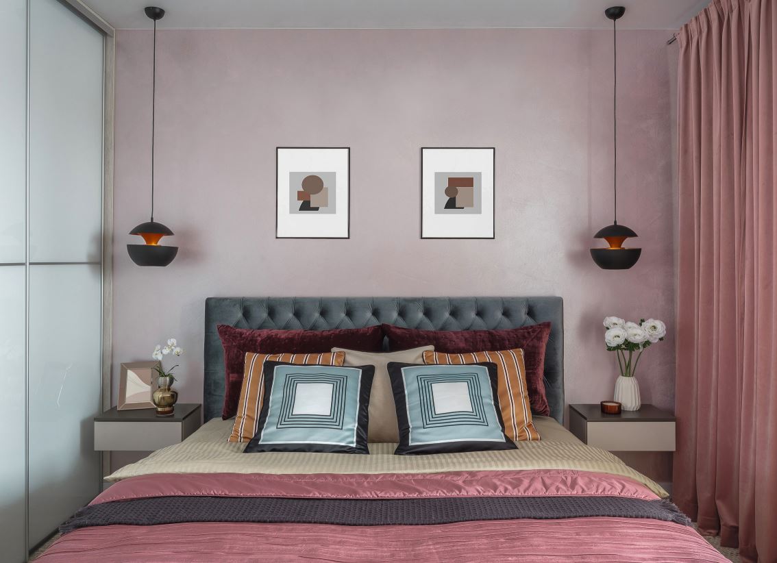Для отделки стен маленькой спальной комнаты лучше выбирать светлые, пастельные оттенки, которые обладают свойством отражения естественного света, что позволяет визуально увеличивать пространство. Также помогут в создании гармоничного интерьера спальни популярные и креативные приёмы дизайнеров. Например, отделку потолка и стен компактной спальни выполнить в одном цвете – это поможет зрительно «поднять» потолок.