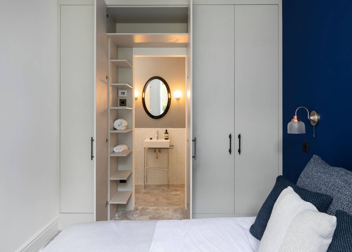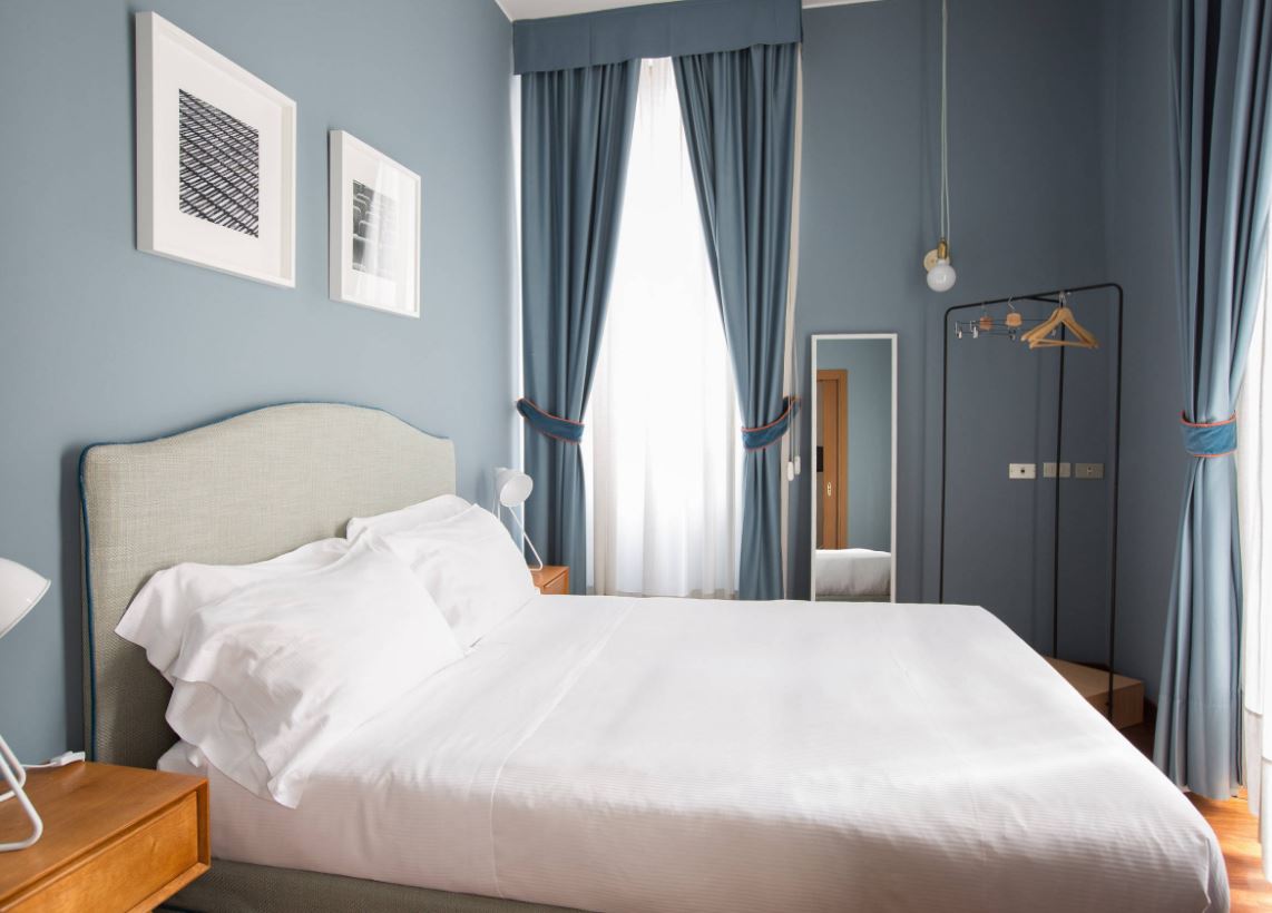 Дополнительно при меблировке могут быть использованы комод, кресло, прикроватная скамья, мобильное напольное зеркало.