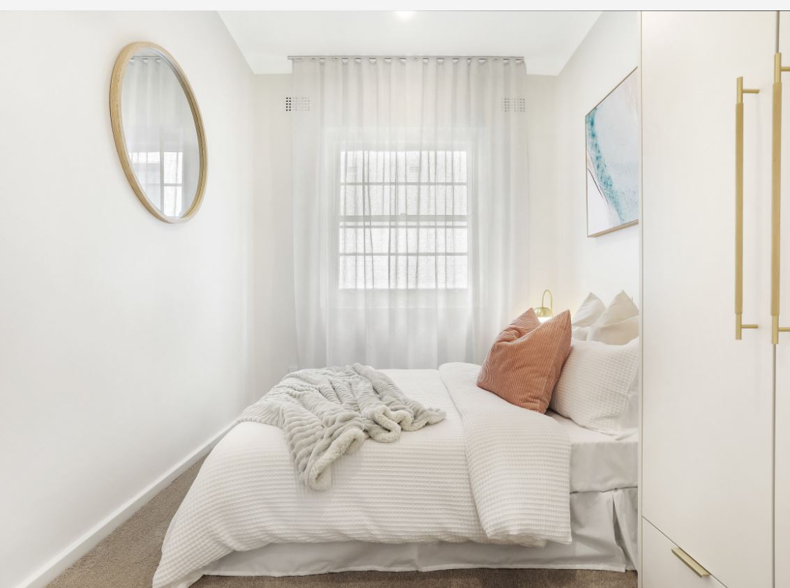 В прямоугольной маленькой спальне обязательно следует визуально расширить пространство, чтобы не создавалось впечатления, что находишься в длинном «вагончике».