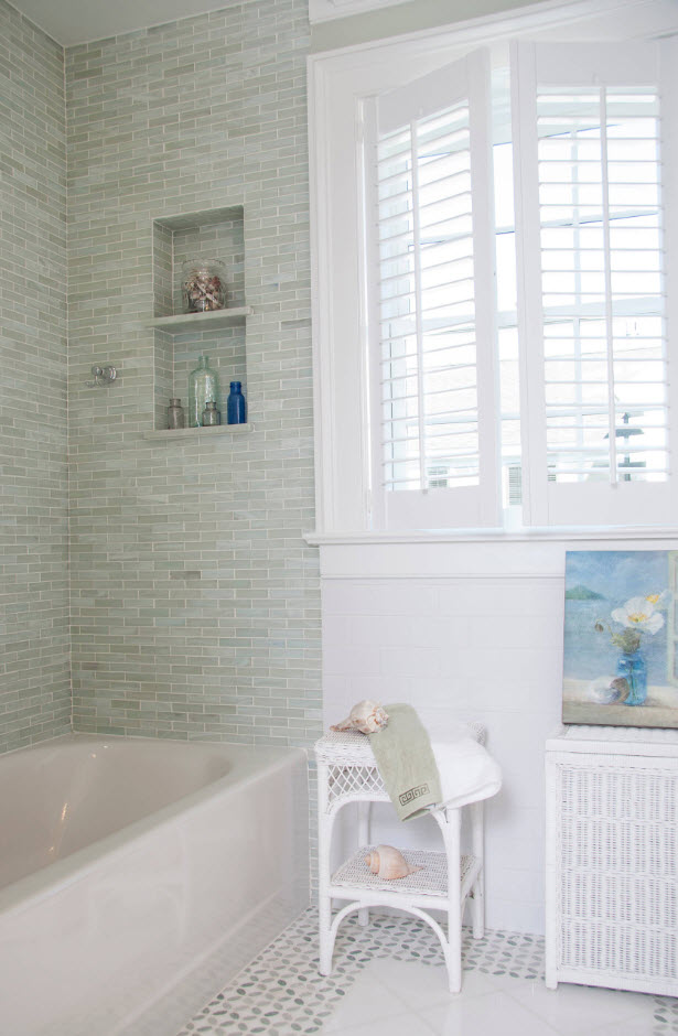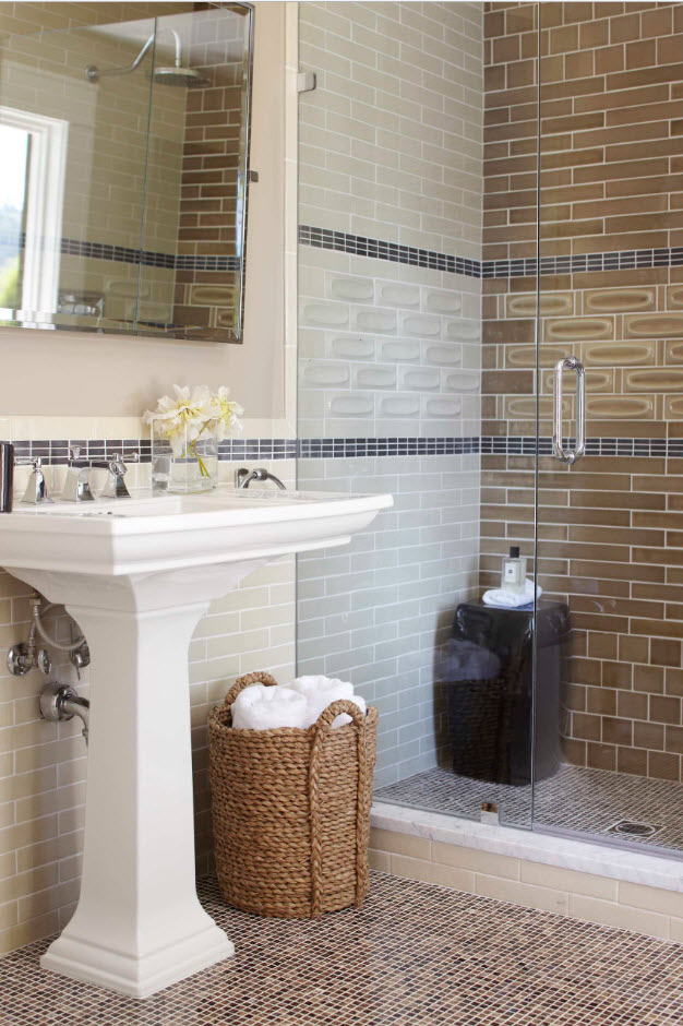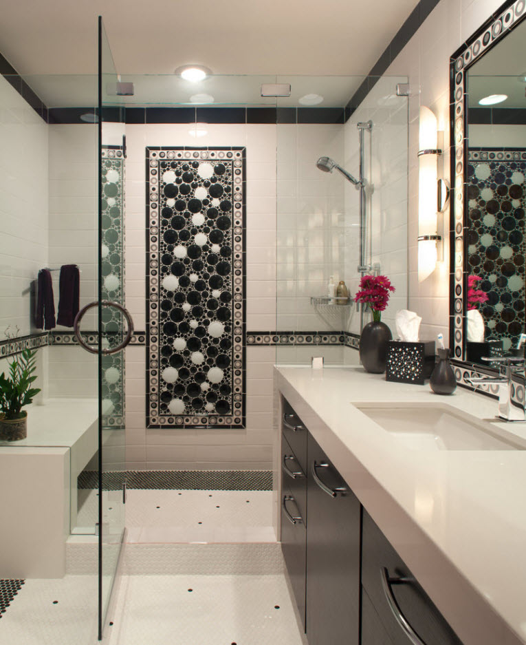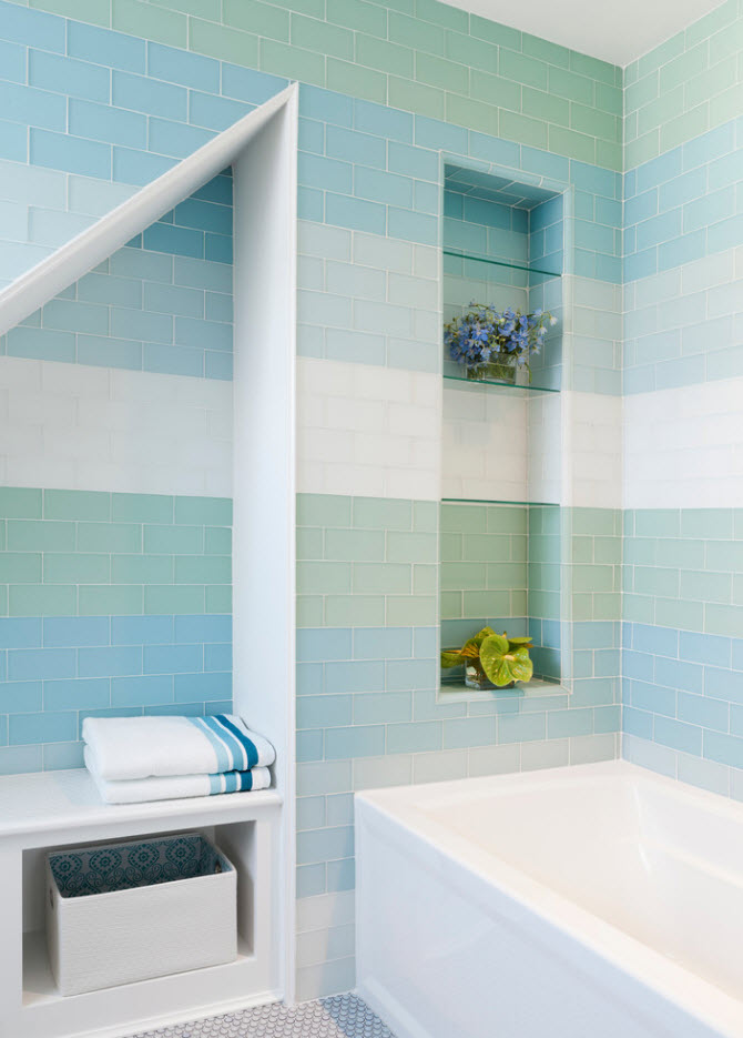 Комбинирование облицовочной плитки разных форм, размеров и цветов может привести к созданию не только привлекательных, но и креативных образов ванных комнат. Помимо этого, при помощи использования цветных вставок можно выделить те или иные элементы и зоны интерьера, визуально изменить объемы помещения и создать цветовые акценты, столь необходимые в светлом пространстве. Цветной окантовкой на светлом фоне модно облицевать зеркало, очертить панели, выделить зону душевой, ванны или раковины.