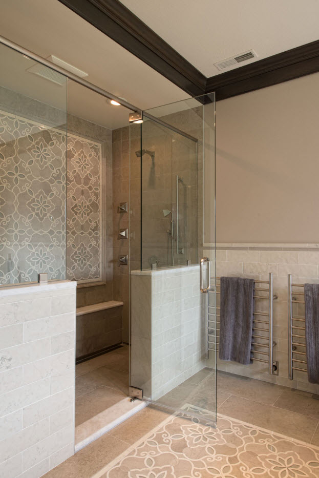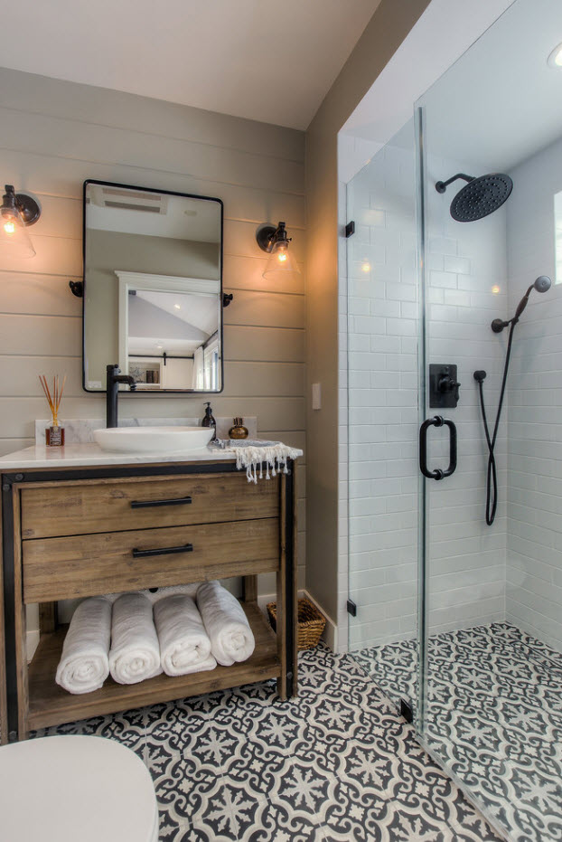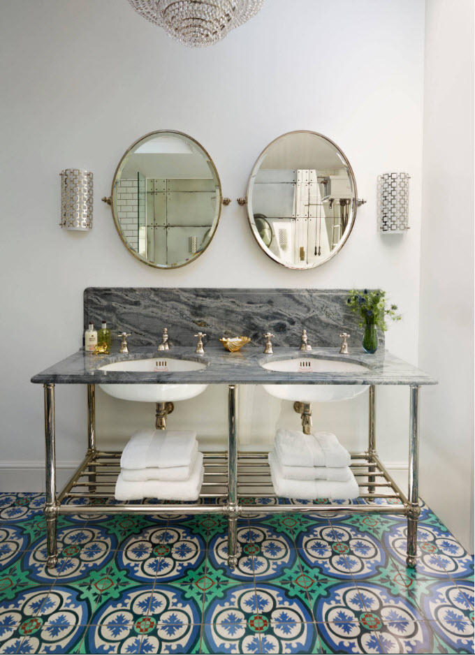 Наиболее органично смотрится плитка с ярким, пестрым орнаментом в качестве материала напольного покрытия в ванной комнате с однотонными, светлыми стенами. Для исполнения такой плитки с принтом достаточно двух контрастных цветов.