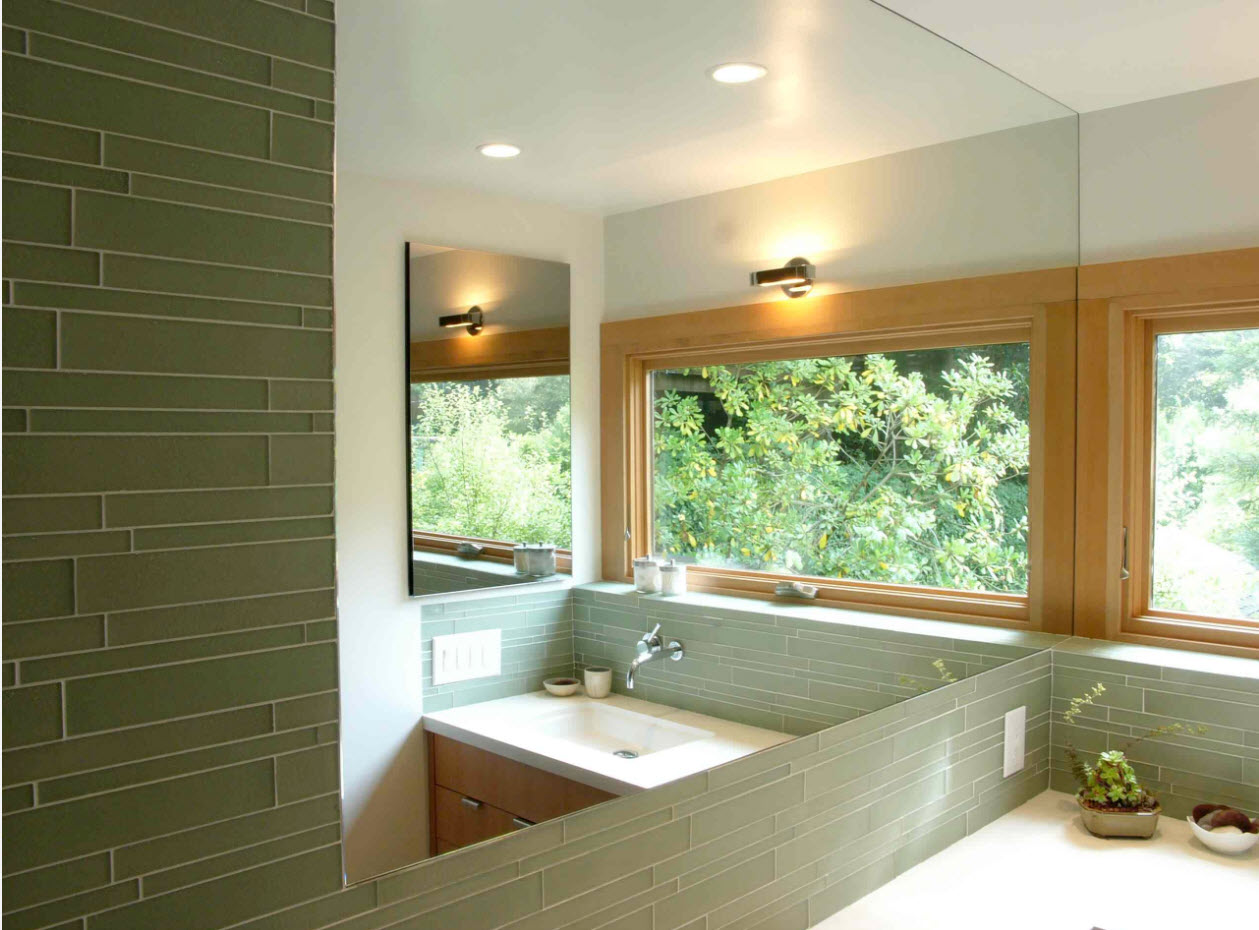 Отделка ванной комнаты при помощи стеклянной плитки встречается нечасто, от того и уникальность подобных дизайн-проектов много выше. Даже небольшие вставки из стеклянной облицовочной плитки способны «оживить» самый заурядный образ утилитарного помещения. Но и у этого материала есть свои минусы – помимо достаточно высокой стоимости, плитка из стекла всегда создает несколько прохладный образ помещения. Стеклянная плитка чаще всего производится в цветном варианте. Многие владельцы домов и квартир выбирают этот материал для создания панно на стене ванной комнаты с фотопечатью. Рисунком может быть что угодно – от красивого пейзажа до семейного портрета.