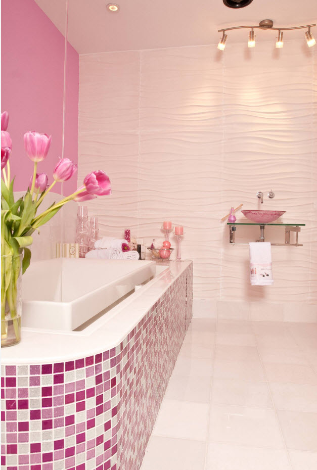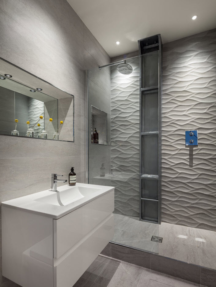 Фактурная плитка способна привнести в интерьер ванной комнаты не только разнообразие, но и креатив. Как правило, рельефные изделия для облицовки стен выполняются в однотонном светлом варианте и при помощи света подчеркиваются фактурные изгибы, впадины и барельефы. Чаще всего фактурную плитку используют для облицовки одно стены для создания некоторого акцента.