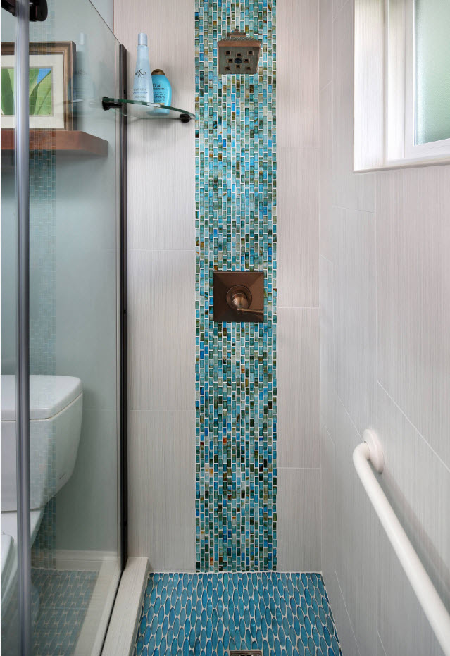 Многие годы популярным цветовым решением для оформления ванной комнаты считается богатый спектр оттенков синего цвета. От бледно-голубого в качестве основного фона до темно-синего в виде акцентной окантовки или небольших включений – синий цвет всегда создает прохладную, легкую и свежую атмосферу в интерьере утилитарного пространства. Белоснежная сантехника отлично сочетается с различными оттенками синего тона. Многие дизайнеры рекомендуют в альянсе с плиткой светло-голубого тона использовать стеклянные перегородки и раздвижные дверцы душевых аналогичного оттенка.