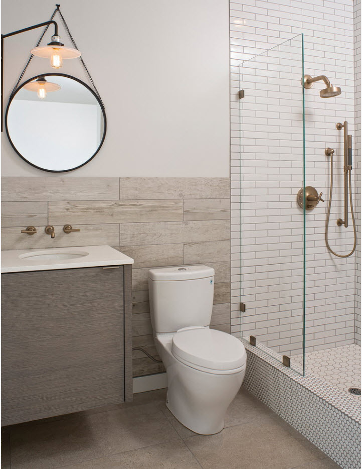 Помимо этого, керамическую плитку можно комбинировать с другими видами отделочных материалов. Безусловно, кафель необходимо использовать в качестве отделки наиболее уязвимых с точки зрения воздействия влаги зон – вокруг ванны и раковины, внутри душевой. Чаще всего из плитки выкладывают так называемый фартук или отделывают поверхность за ванной полностью – все зависит от расположения сантехники в ванной комнате.