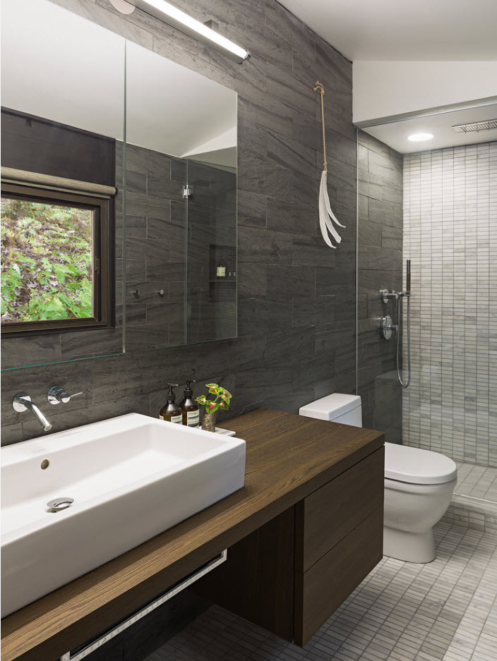 Ставший столь популярным в прошлом сезоне, серый цвет, не теряет своих лидирующих позиций в топ-листе цветовых решений для помещений самой разнообразной функциональной нагрузки. Ванные комнаты не стали исключением. Богатая палитра оттенков серого цвета позволяет составлять строгие, но при этом элегантные образы утилитарных помещений, не лишенных своей изюминки. К тому же, на сером фоне блистательная белизна сантехники смотрится особенно эффектно.