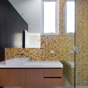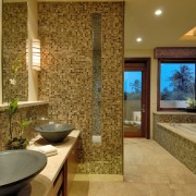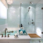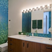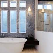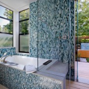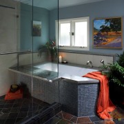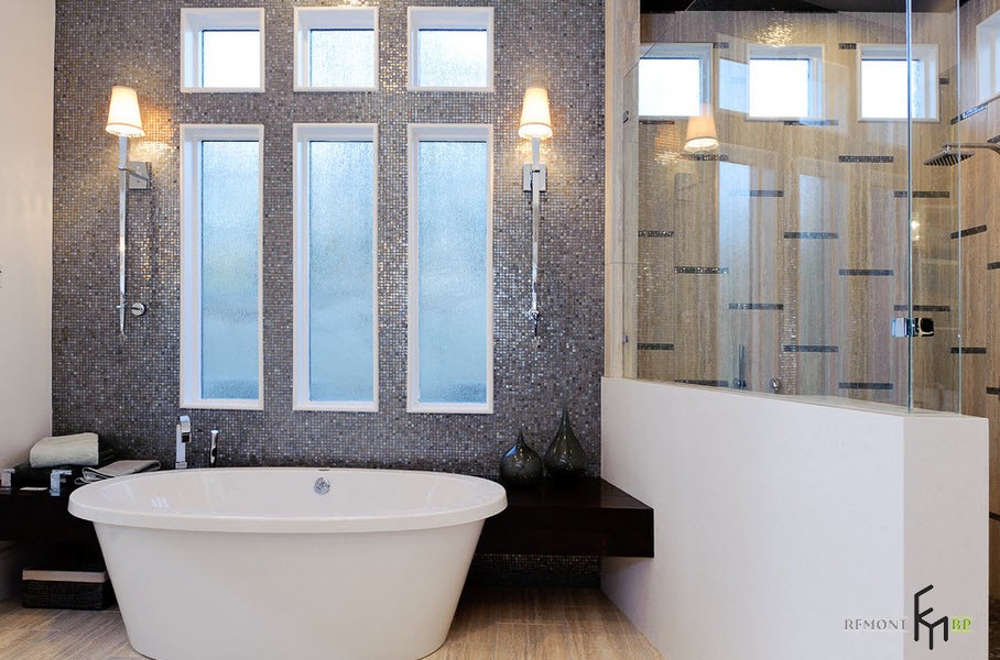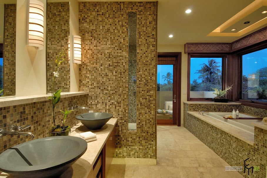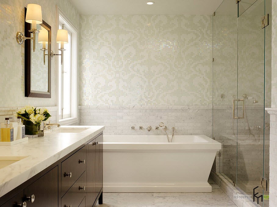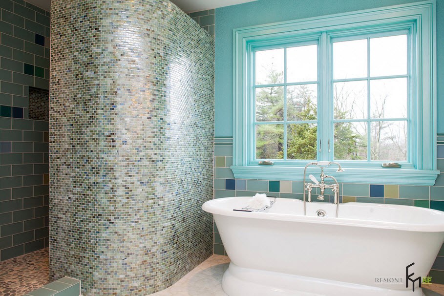 В помещениях бань, саун и ванных комнат мозаика выполняет практические функции. Такой материал надежно защищает стены от воздействия влаги, не позволяя ей проникать в щели между бетонными плитами или другими строительными материалами.