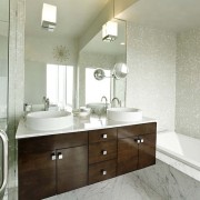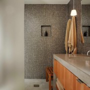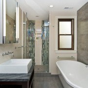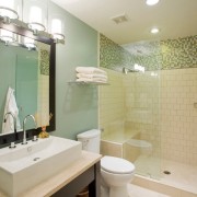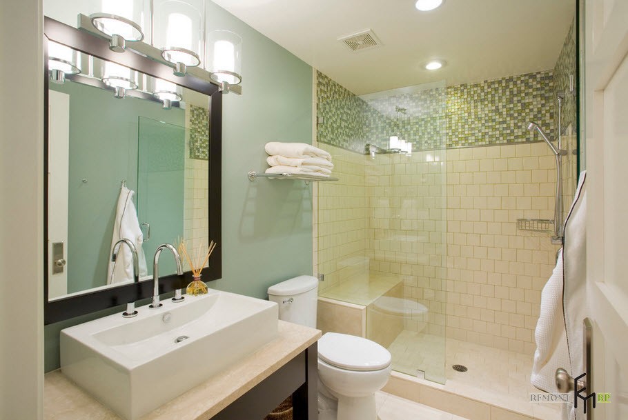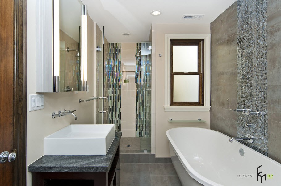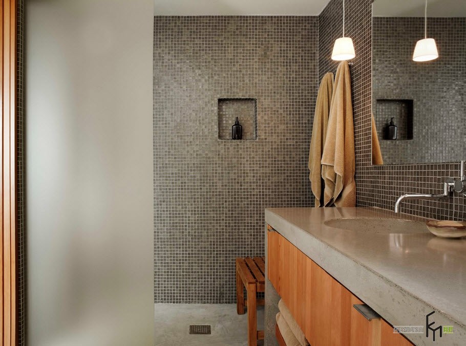 Интересным может быть коврик на полу ванны, выполненный мозаикой из галечного камня. Такое необычное решение будет выглядеть оригинально, оказывая при этом терапевтическое влияние на ступни. Пол в душе лучше выкладывать рельефной мозаикой, чтобы снизить риск подскальзывания во время водных процедур.