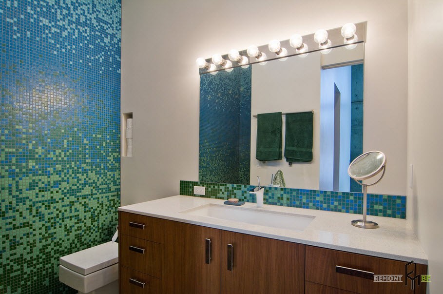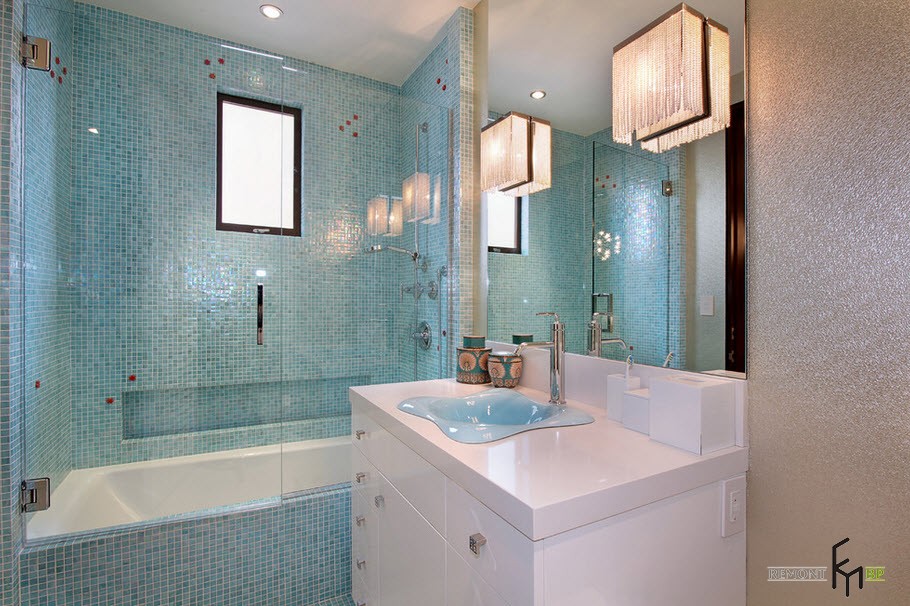 Расцветка такого облицовочного материала дает дизайнеру большой простор для фантазии. Элементы мозаики могут быть ярких сочных цветов или спокойных постельных оттенков. Необычными разновидностями можно считать прозрачные, перламутровые или даже зеркальные детали.