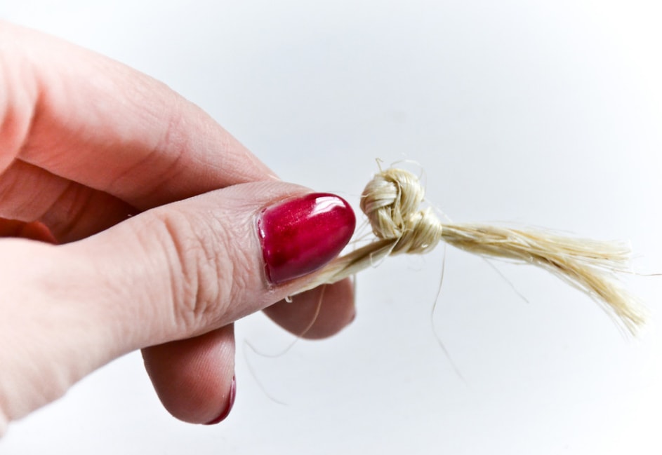 Когда все элементы гирлянды будут собраны, завязываем второй конец веревки двойным узлом.