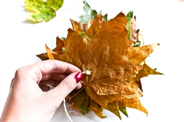 Берем несколько листьев и в центре делаем небольшое отверстие. Аккуратно продеваем сквозь него веревку, чтобы не порвать их.