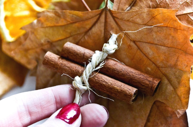 Таким же образом добавляем две палочки корицы, оборачиваем их веревкой и фиксируем узлом.