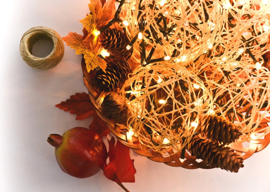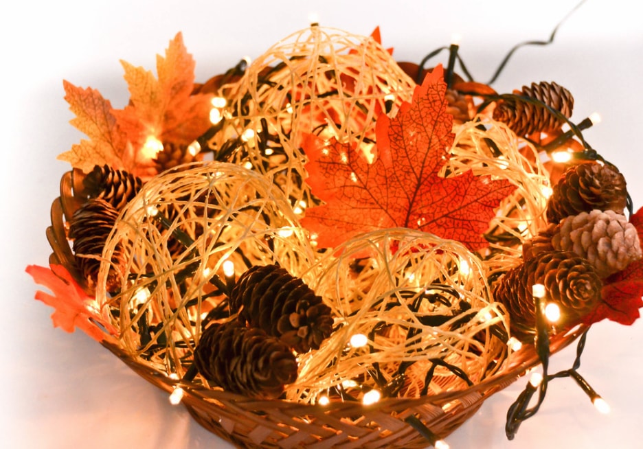 Плетеную корзинку небольшого размера заполняем шариками с гирляндой. Декорируем композицию различными осенними листьями и шишками. Смотрится это очень привлекательно.