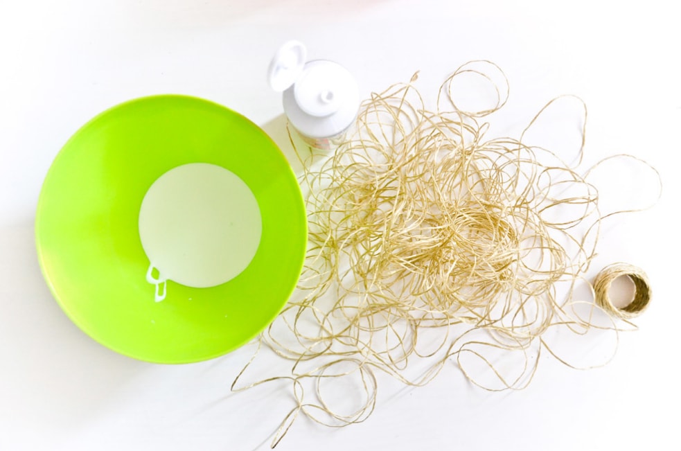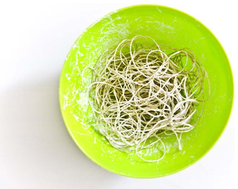 Окунаем бечевку в клей таким образом, чтобы она полностью им пропиталась. При необходимости можно добавить еще немного клея.