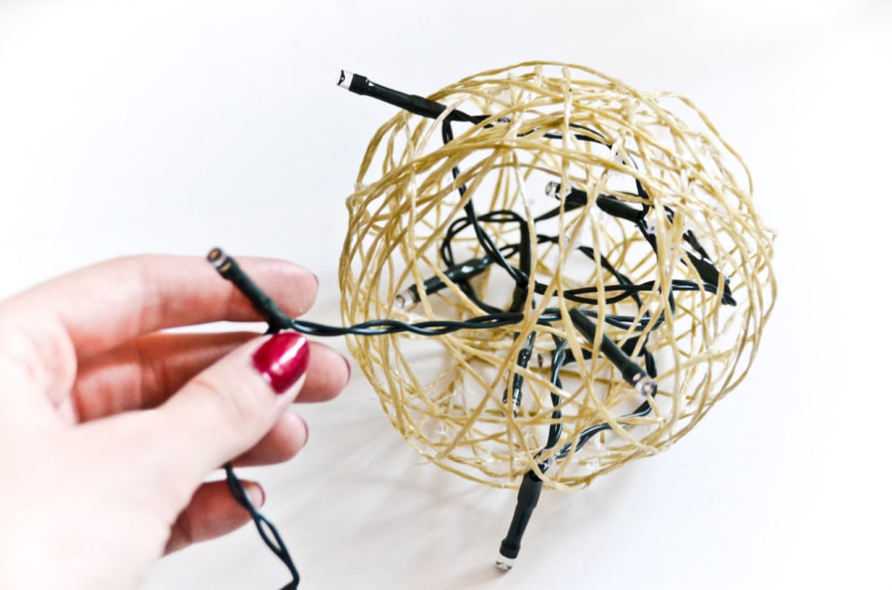 Аккуратно размещаем часть гирлянды внутри каждого шарика.