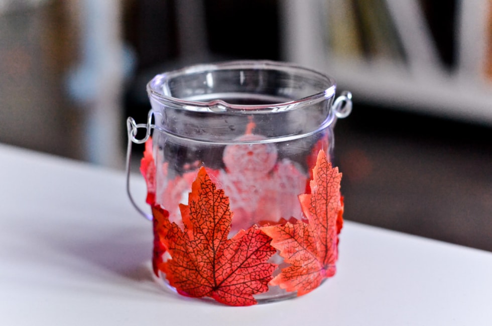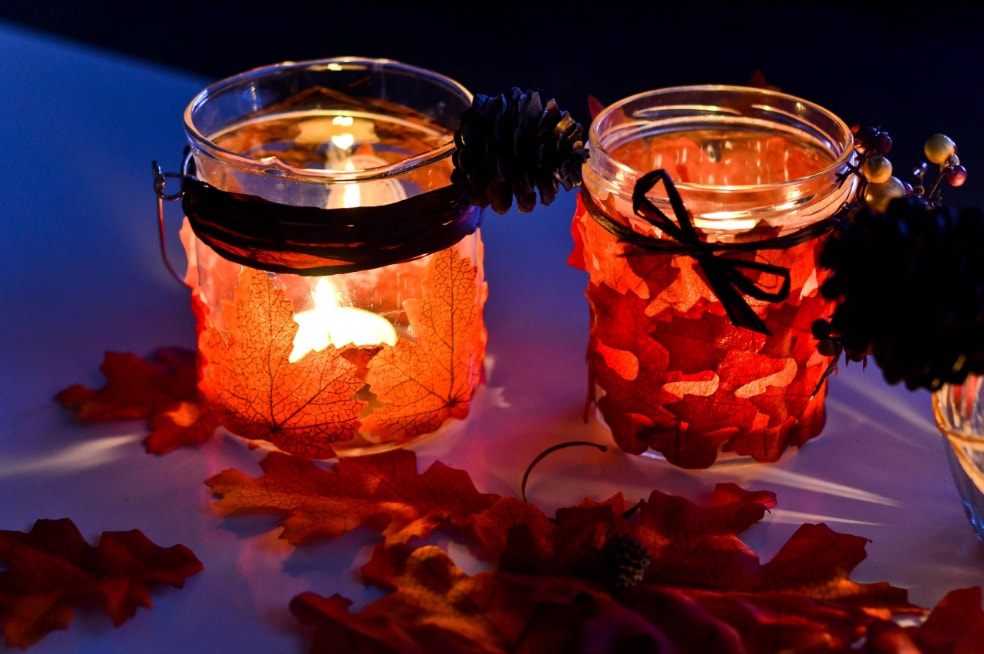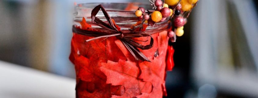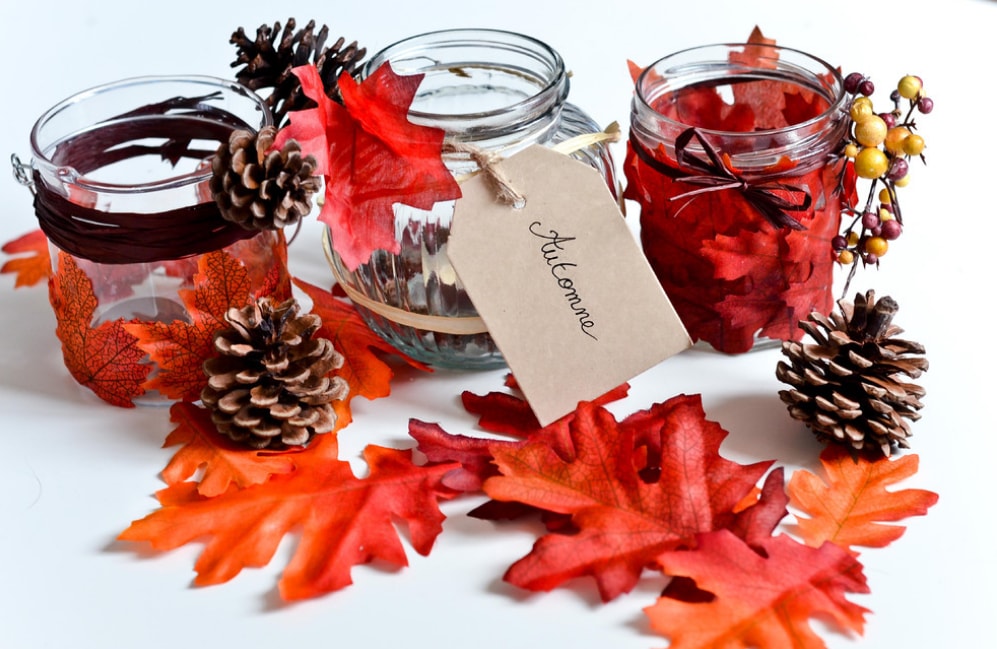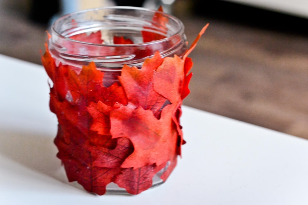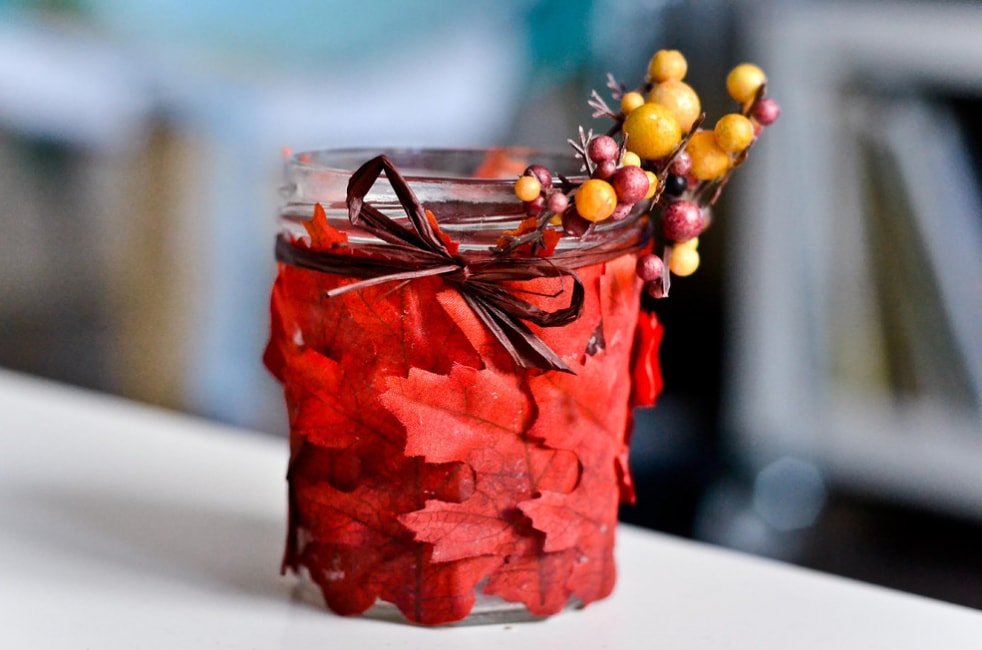 Для этого украшаем листьями нижнюю часть банки или подсвечника. Чтобы они крепко держались, используем клей.