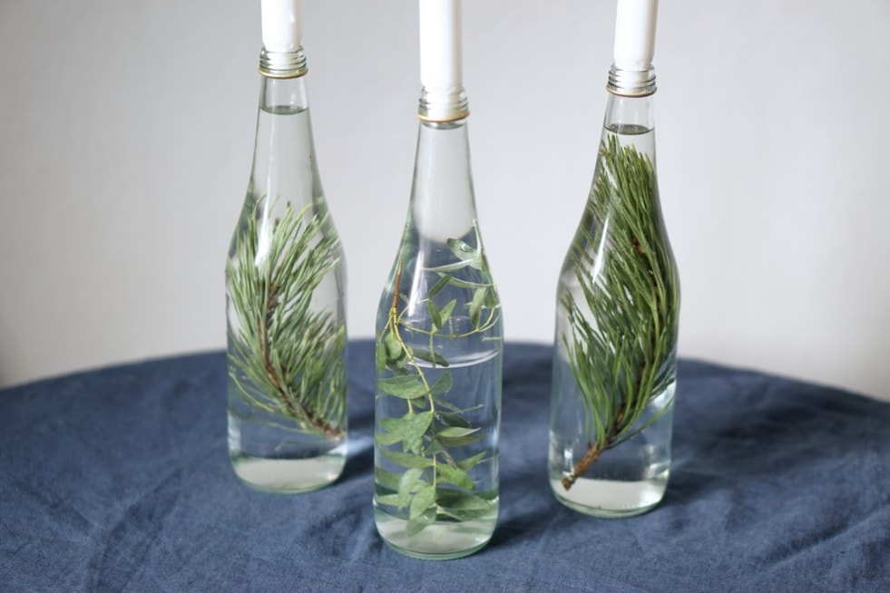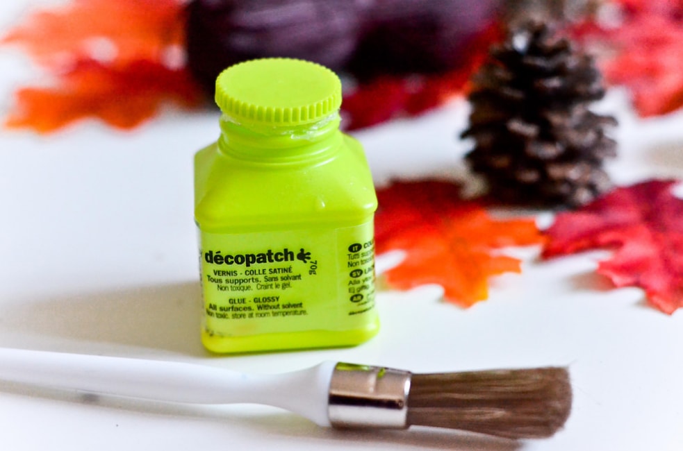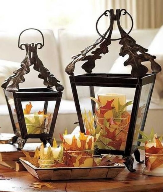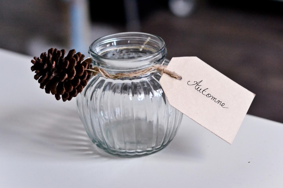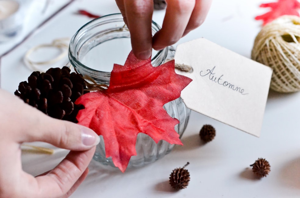 Для этого украшаем листьями нижнюю часть банки или подсвечника. Чтобы они крепко держались, используем клей.