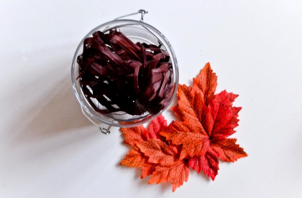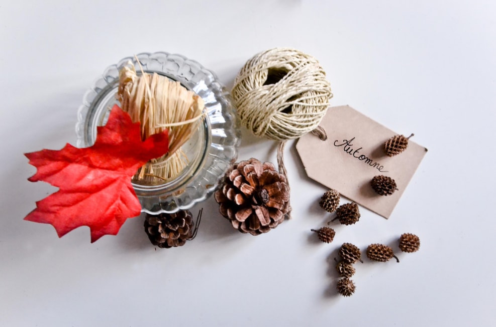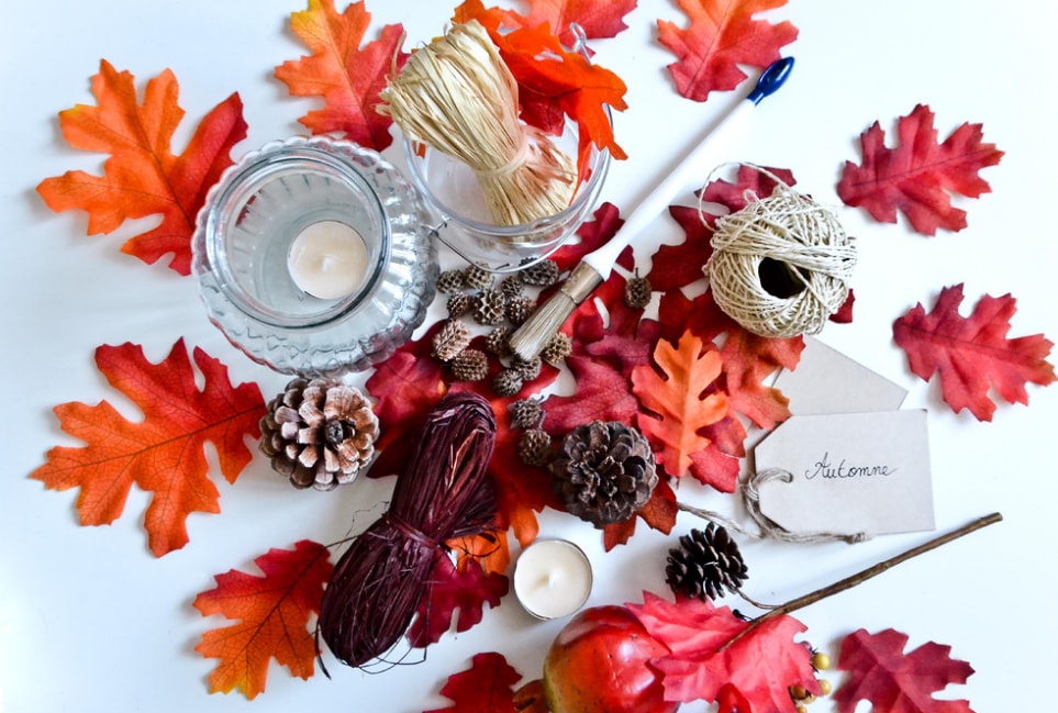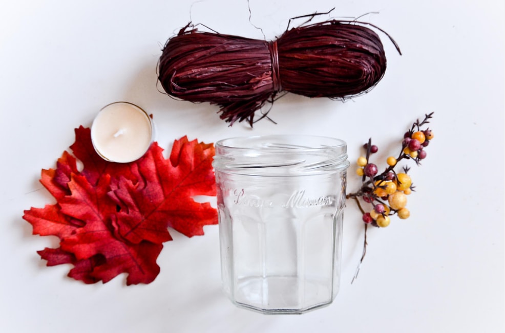 Приступаем к декорированию первого подсвечника. Для этого подготавливаем стеклянную банку, свечу, осенние листья и декор.