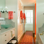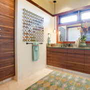На коврик можно нанести узор или картину. Это может быть лесной пейзаж или морское побережье. Изображение рыбок и других морских животных и растений тоже будет подходящим рисунком для такой обстановки.