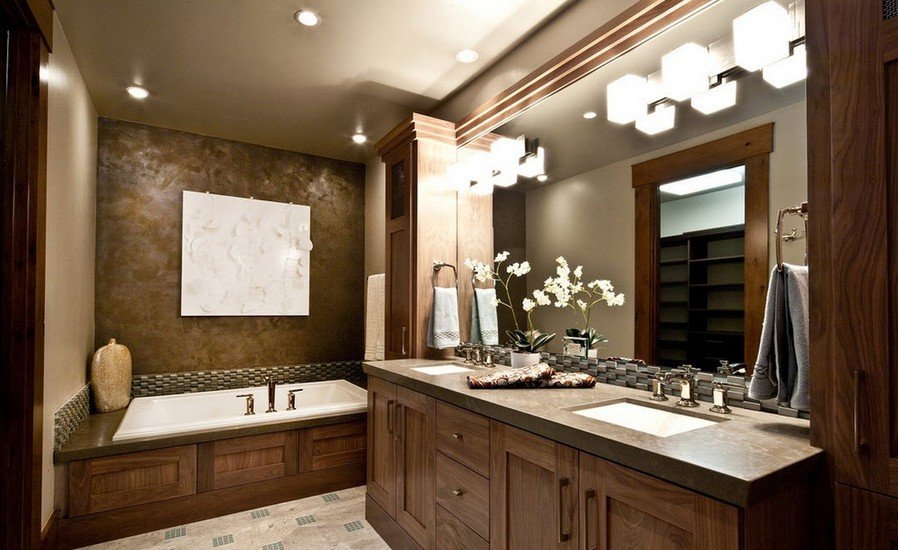 Рядом с раковиной допускается только около 12 вольт. Чаще всего выбирается три лампы на стене, а не в низу, чтобы не ослеплять. Также подумайте о углубленных светильниках в самом зеркале Очень практично!