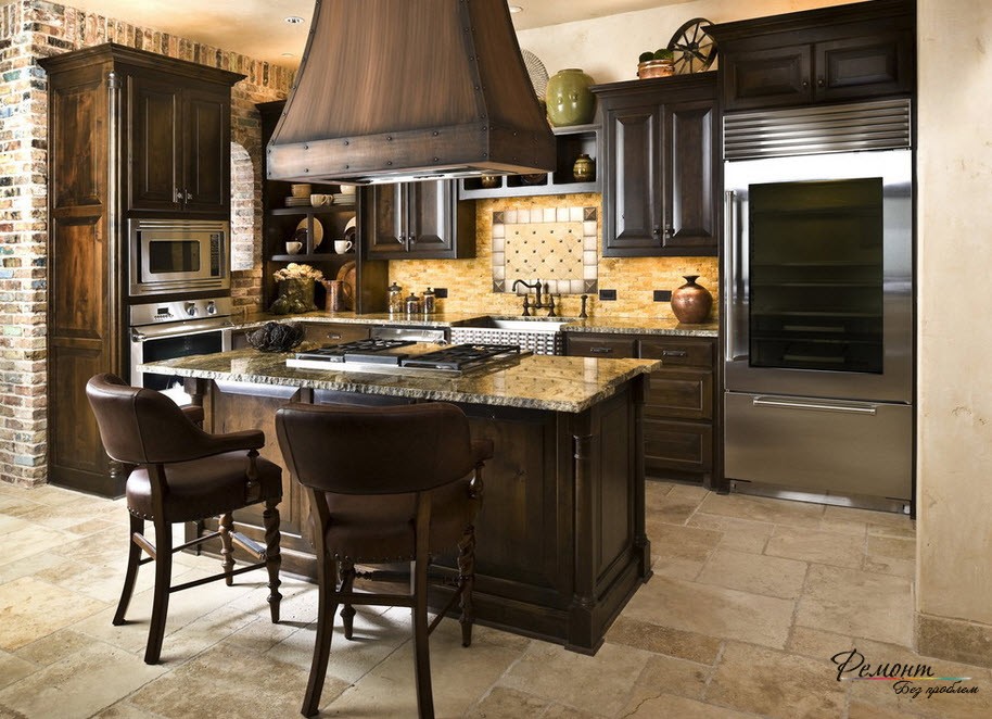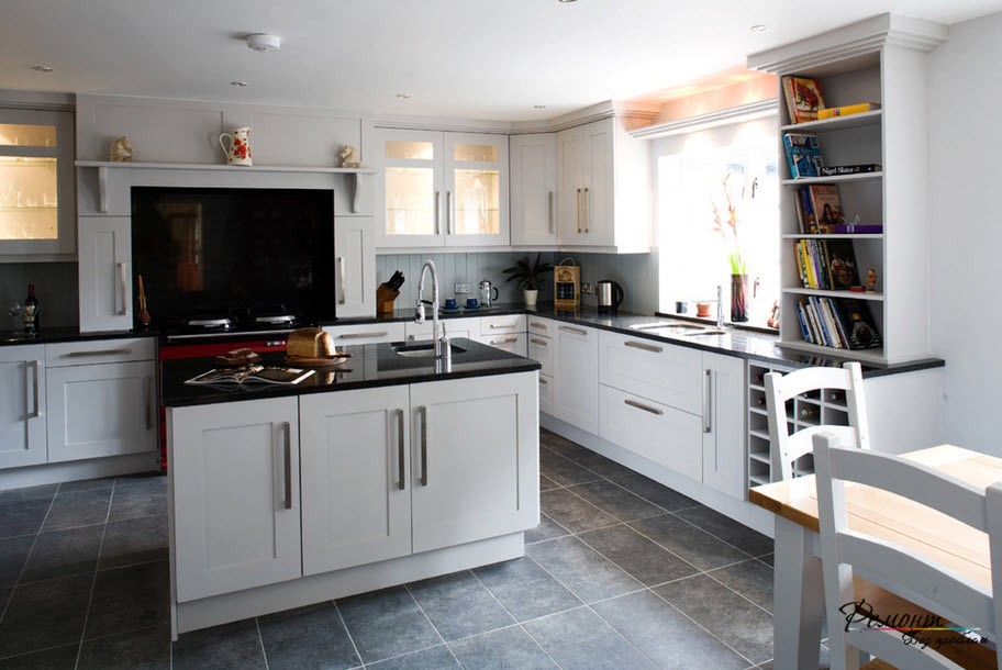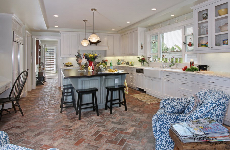 Каменная кладка на полу в кухне — это не столь популярное решение, но, тем не менее, заслуживающее внимания. Чаще всего, останавливая свой выбор на камне, дизайнеры используют гранит, песчаник или известняк. Гранит сам по себе можно назвать универсальным материалом, ведь его очень легко чистить, он не поддаётся воздействию влаги и не реагирует даже с агрессивными чистящими средствами. Песчаник и известняк менее популярны из-за своей пористости, которая делает их уязвимыми перед влагой и некоторыми видами загрязнений, но всё же остаются прекрасным выбором для тех, кто решил делать на своей кухне каменный пол. На самом деле каменная мозаика или пол из пластин разного цвета может смотреться очень оригинально, а правильно подобранная текстура камня станет изюминкой любого интерьера. В последнее время многие дизайнеры перестают идеально выравнивать каменные плиты и покрывать их лаком, частично сохраняя уникальную текстуру камня, которая делает интерьер по-настоящему уникальным.