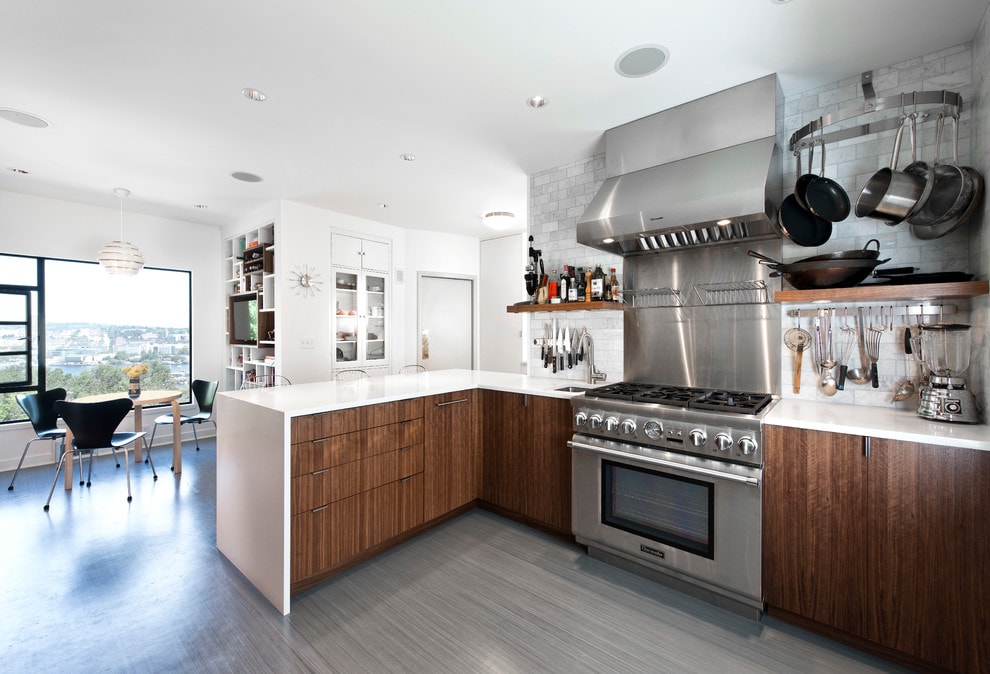 Ламинат — идеальная альтернатива реальному деревянному полу. Ламинированные полы отличаются разнообразием цветов и узоров, прекрасно воспроизводят расцветки натурального дерева, но значительно дешевле природного материала. Они придают теплую и уютную атмосферу кухне, соответствуя многим стилям дизайна интерьера. Их основным преимуществом является долговечность.