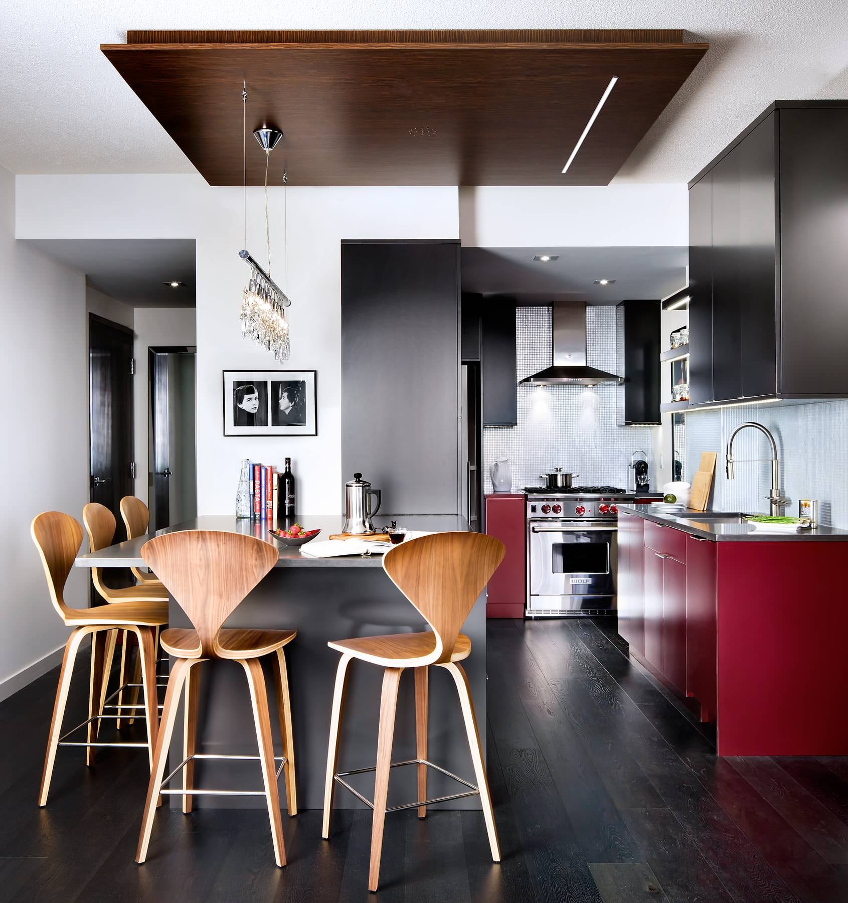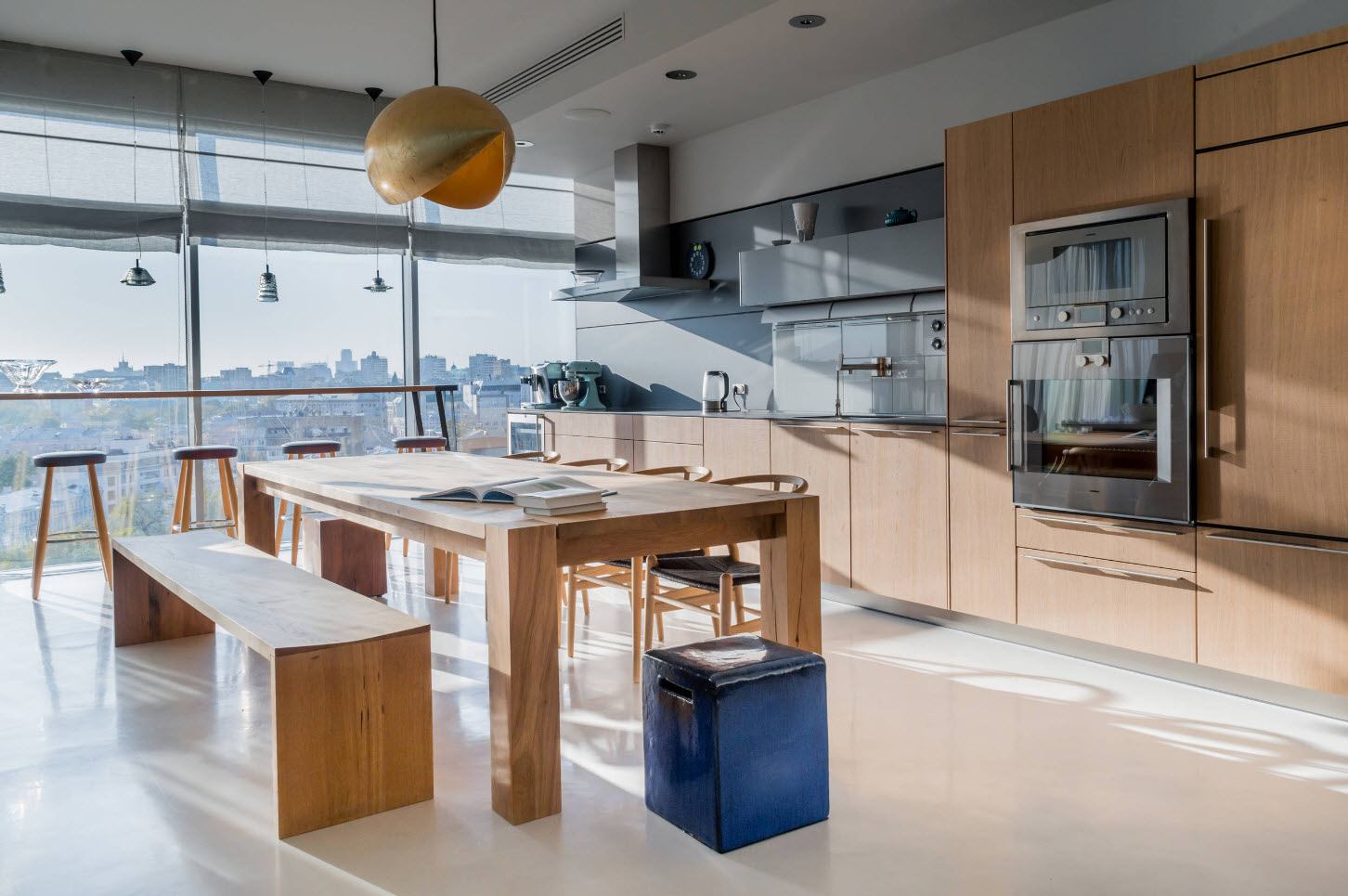 Среди доступных видов деревянных полов на кухне лучше использовать паркет или твердые древесные плиты, но они должны быть закреплены уплотнительной кромкой, которая не допустит просачивания воды. Вы также можете поместить несколько лакированных деревянных панелей. На полу в кухне отличным выбором станут местные виды древесины: дуб, бук, клен, платан, орех и т.д. Выбирайте породы высшего сорта с однородным цветом, даже зерном, без сучков, которые могут выпасть под воздействием эксплуатации и влаги. Помните также, что на темной древесине вы можете видеть пыль, царапины и следы грязи, что особенно актуально на кухне.