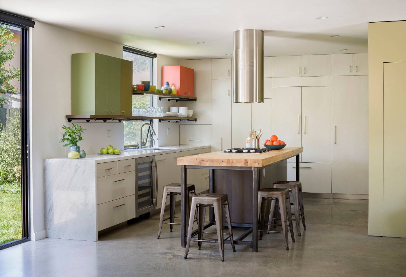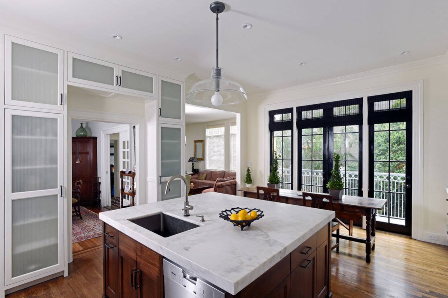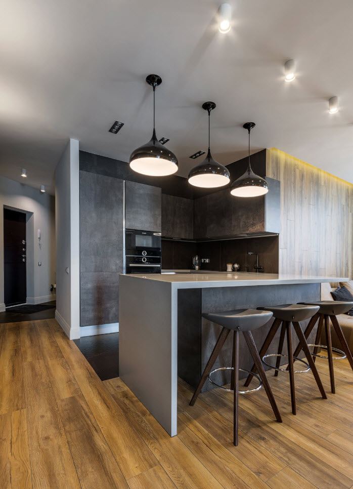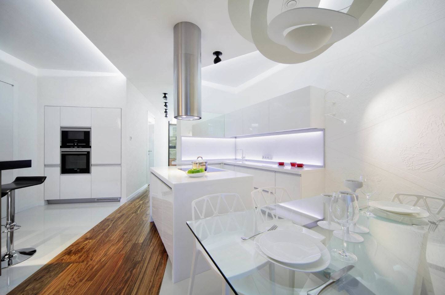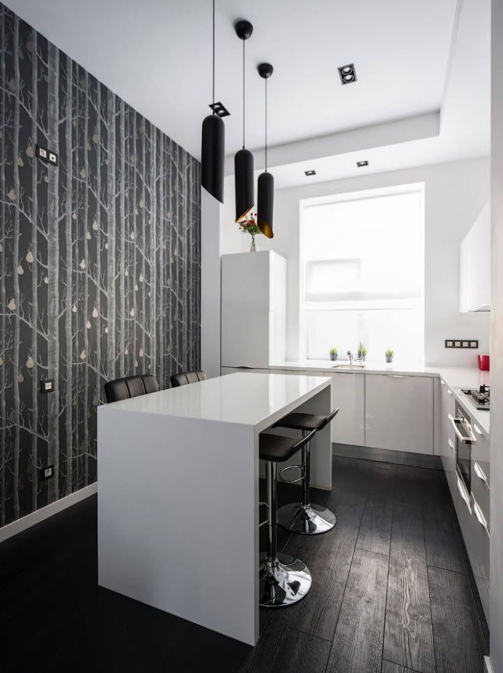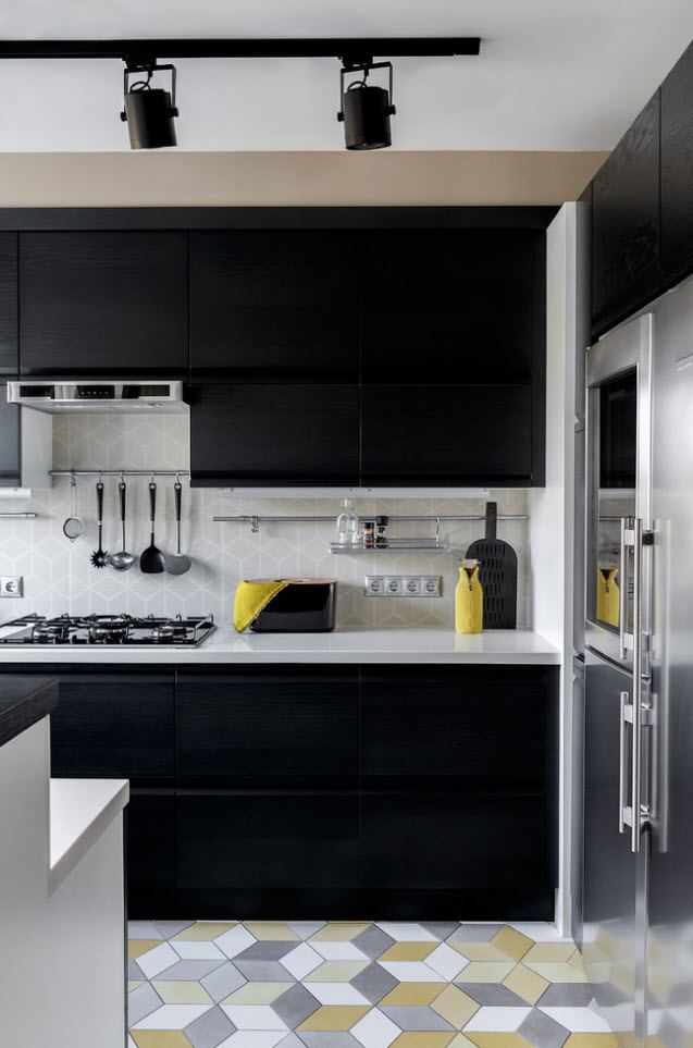 Полы на кухне лучше всего отделывать материалом, который способствует устойчивости к истиранию, долговечности и легкому очищению. Например, керамические плитки имеют такие особенности. Среди них легко используются фарфоровые и глазурованные изделия из керамики. Кафель обладает низкой поглощаемостью, быстро очищается, его не нужно окрашивать. Плитка — это прочный метод отделки эстетического и устойчивого пола. Однако такой выбор не из дешевых. Используйте темную или светлую плитку в сочетании с легкой современной мебелью.