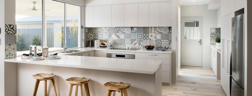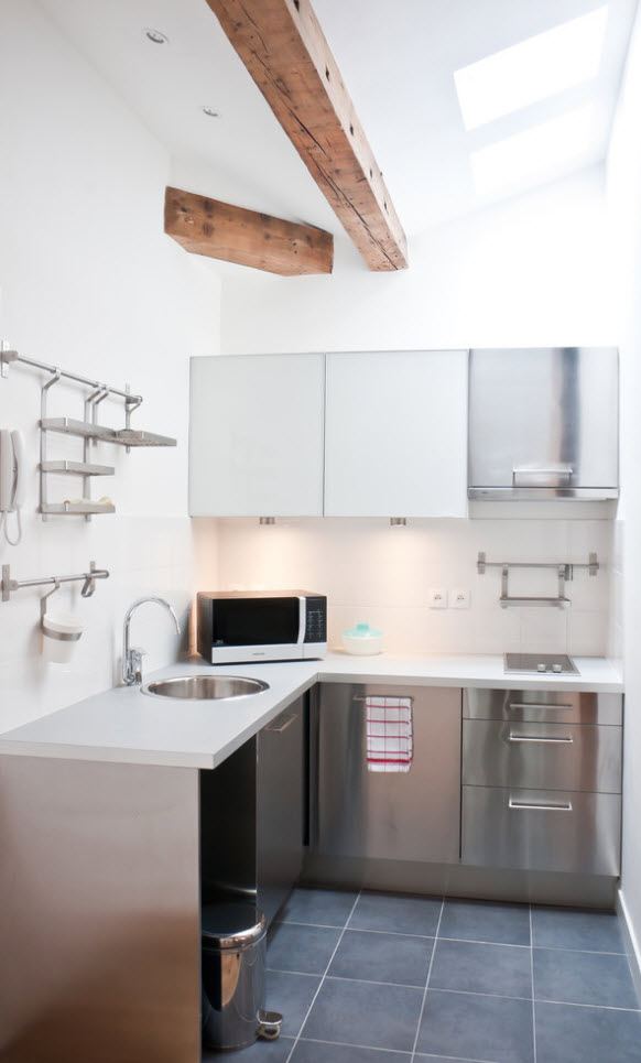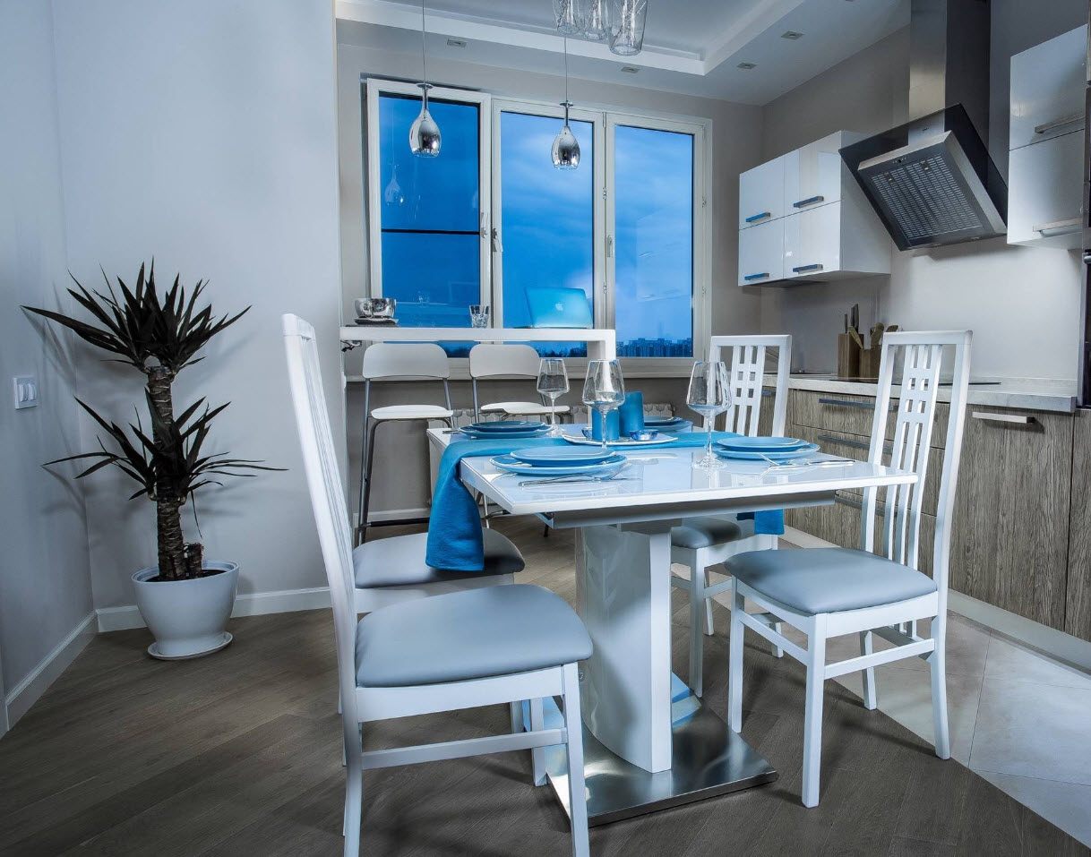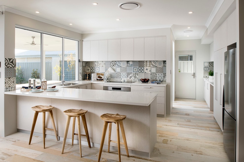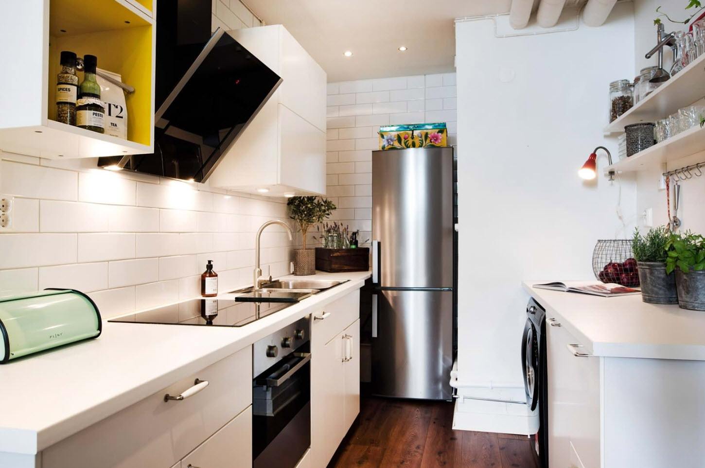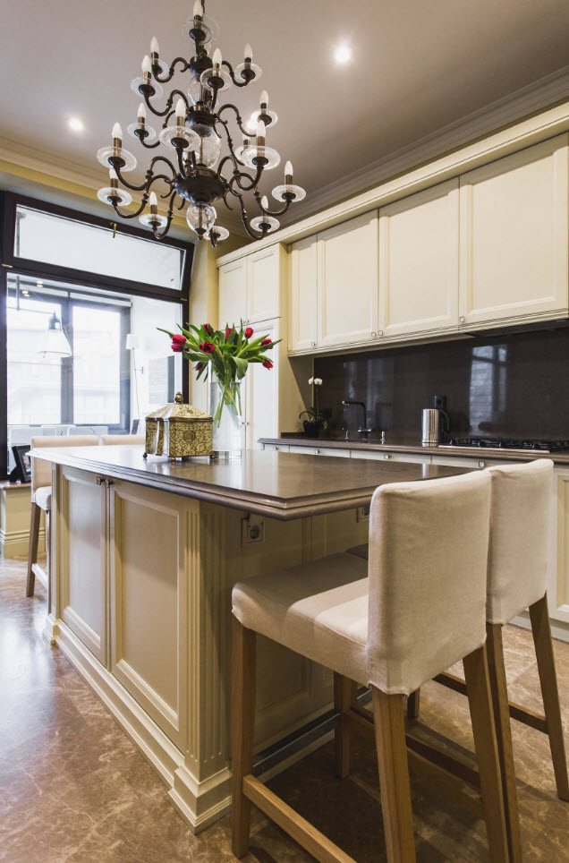 Полы на кухне лучше всего отделывать материалом, который способствует устойчивости к истиранию, долговечности и легкому очищению. Например, керамические плитки имеют такие особенности. Среди них легко используются фарфоровые и глазурованные изделия из керамики. Кафель обладает низкой поглощаемостью, быстро очищается, его не нужно окрашивать. Плитка — это прочный метод отделки эстетического и устойчивого пола. Однако такой выбор не из дешевых. Используйте темную или светлую плитку в сочетании с легкой современной мебелью.