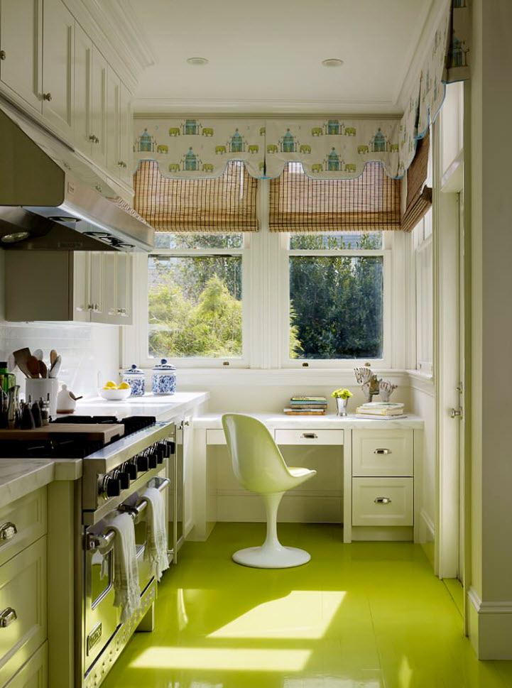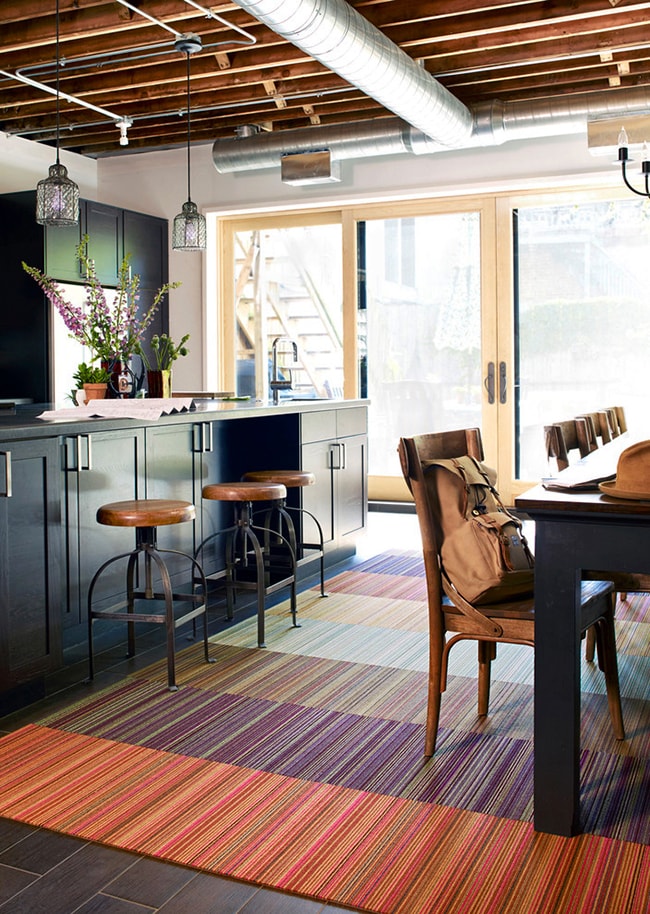 Ковры должны гармонизировать со стилем кухонной мебели и бытовой техники, с которыми вы имеете дело в интерьере. Выбирайте узорчатые изделия и напольный текстиль из меланжа, так как любые крошки и загрязнения на кухне неизбежны, но они не будут такими заметными, как на однотонном ковре. Преимущество небольших ковров в том, что их можно скатывать и встряхивать в любое время.