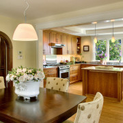 Деревянный пол будет определенно теплым и не только визуально, но и физически, на ощупь. Древесина также имеет хорошую звукоизоляцию, выглядит наиболее натурально из всех типов полов. Обустройство деревянным полом несет в себе признаки комфорта. На кухне можно пролить что-либо на пол, упадет острый предмет, поэтому поверхность должна быть устойчива к влаге и механическим повреждениям.