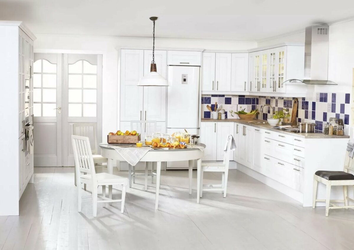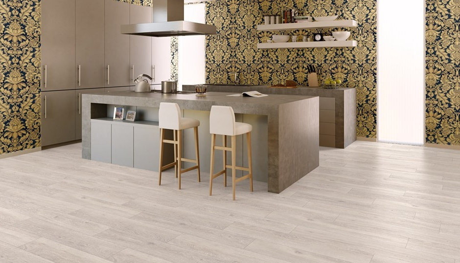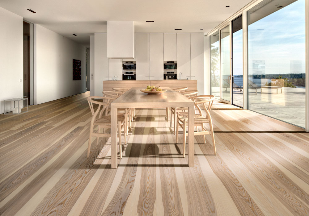 Может показаться, что белый пол не будет работать на кухне, однако, благодаря соответствующей пропитке, он может быть защищен от пятен или другой грязи. Благодаря нескольким покрытиям лаком с использованием УФ-технологии, пол будет отвечать высоким критериям качества. Очень важно, чтобы слой лака не создавал искусственное воздействие на доски, потому что из-под него выделяется натуральная структура дуба. Таким образом, белый пол одновременно и практичен, и красив.