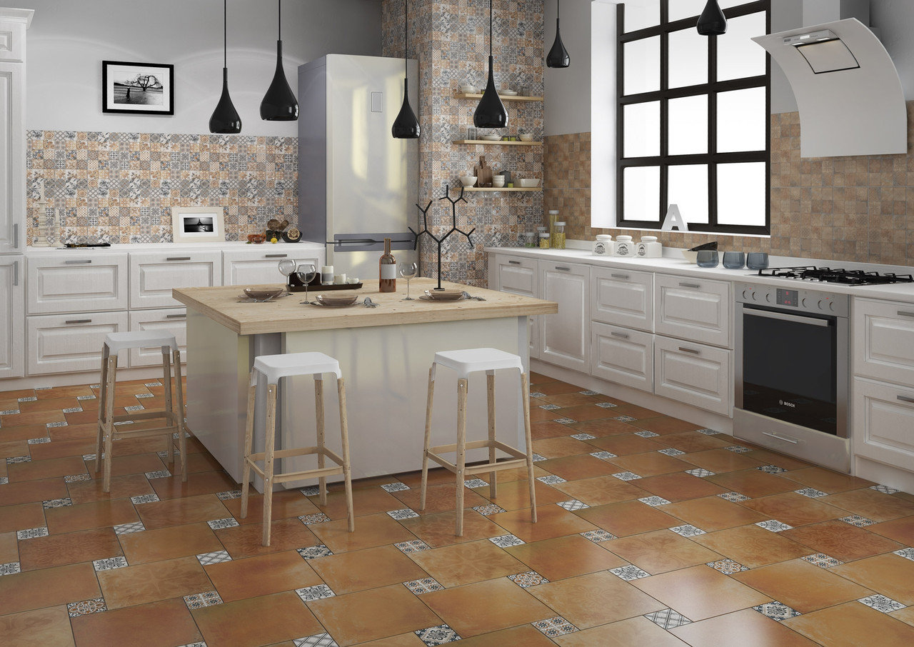 Керамогранит отличается от терракоты или клинкера. Эти плитки, по сравнению с твердой керамикой, изнашиваются быстрее и ломаются легче. Существует также натуральный и технический материал, называемый гресом. Он обладает всеми преимуществами глазурованной плитки, за исключением эстетической ценности, так как имеет немного отличающиеся пропорции компонентов. В состав материала входит качественная глина, влияющую на эстетику и цветовое разнообразие. Вы можете увидеть естественную зернистость на террасах или лестницах, хотя некоторые коллекции плитки могут соответствовать интерьеру кухни, но в чрезвычайно минималистском, почти аскетическом стиле. Керамическая плитка на полу комнаты для приготовления пищи является наиболее распространенным вариантом.
