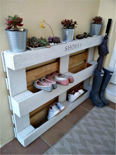 Все большую популярность с каждым годом набирает необычная мебель и предметы декора, сделанные из поддонов. Казалось бы, простой транспортировочный материал, но тем не менее из него можно сделать многое, даже полку для обуви.