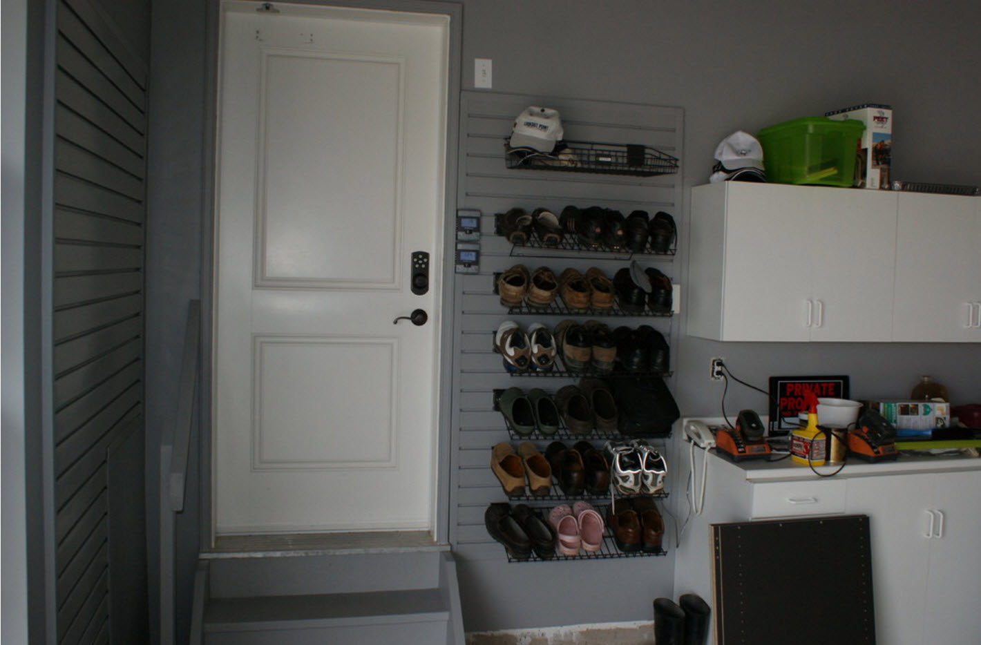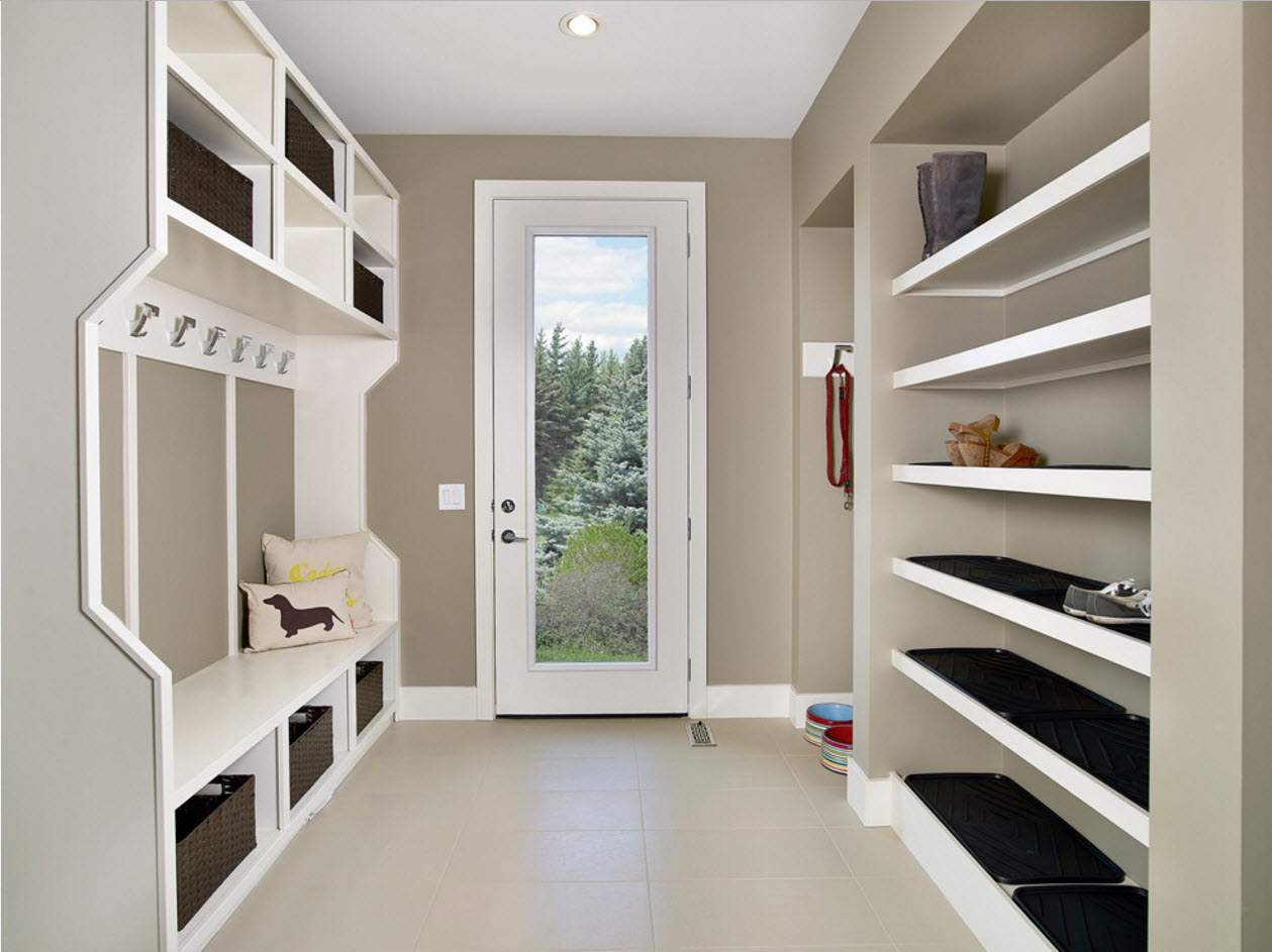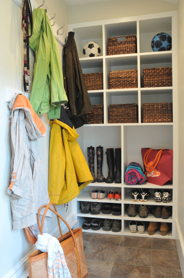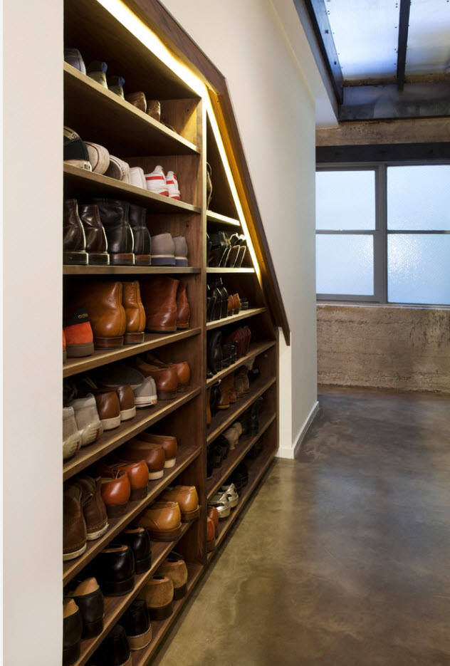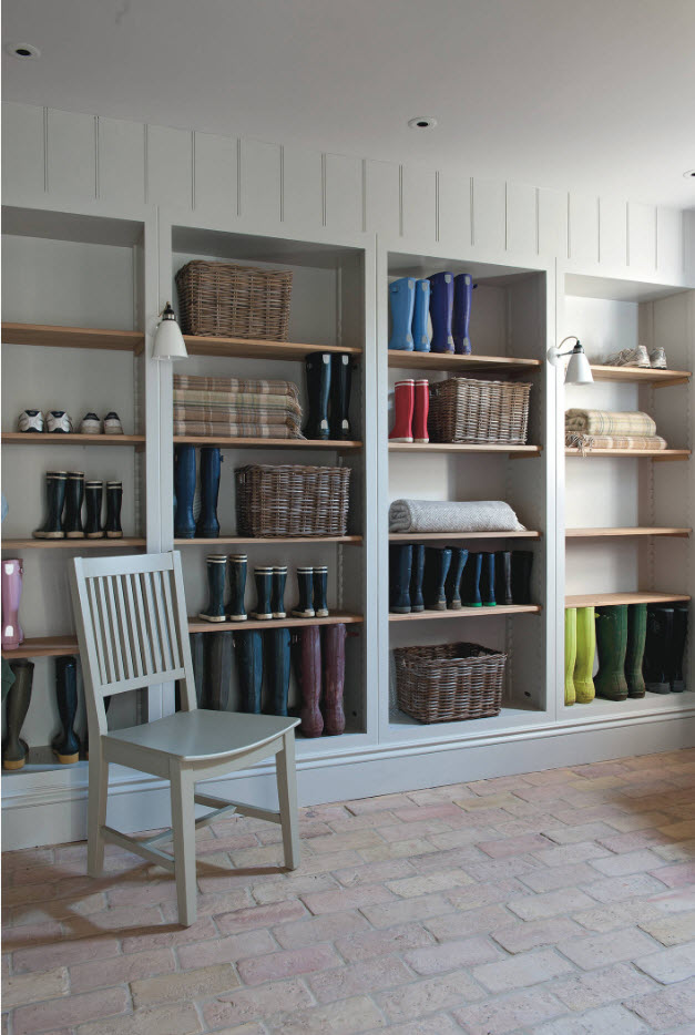 Если в любом из ваших утилитарных пространств есть место для установки невысокого стеллажа с открытыми полками – можно смело утверждать, что вопрос хранения обуви решен. В коридоре, возле лестницы, в прачечной (с хорошей системой принудительной вентиляции) можно использовать небольшое количество полезного пространства для установки нескольких полок для обуви.