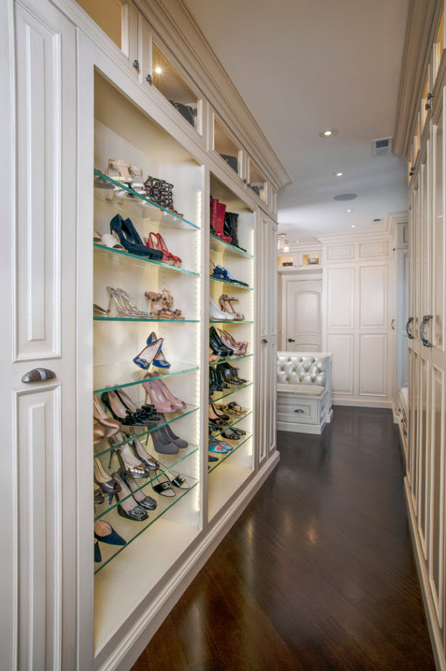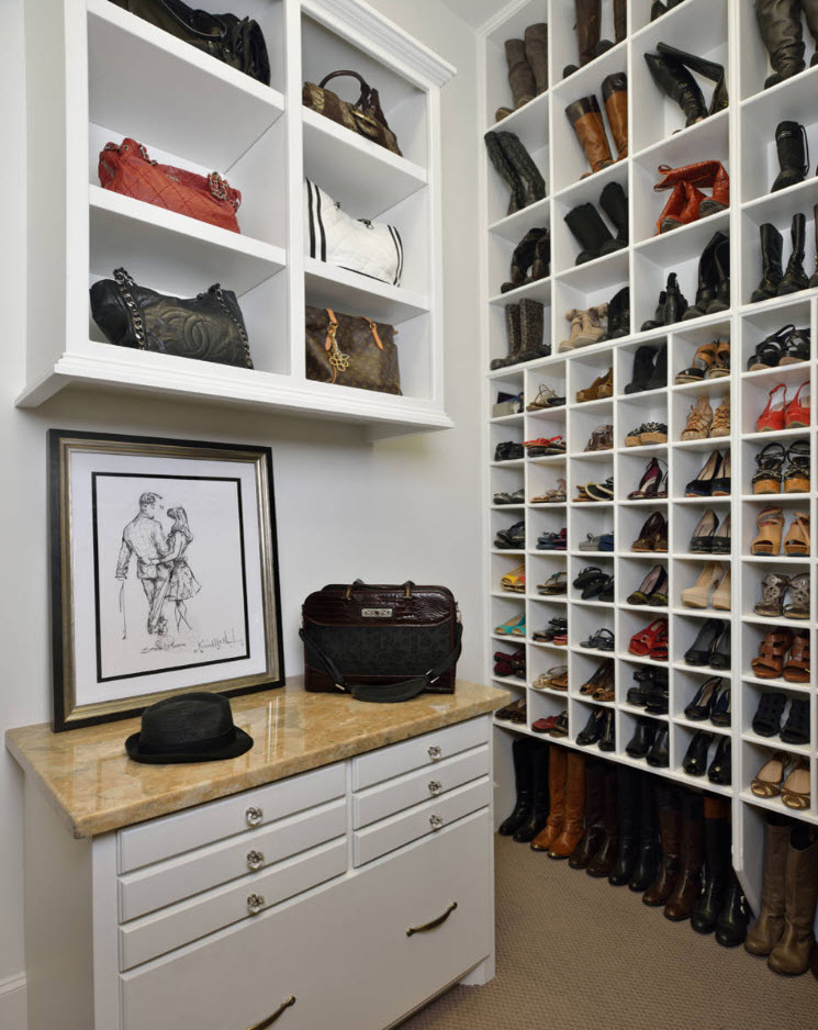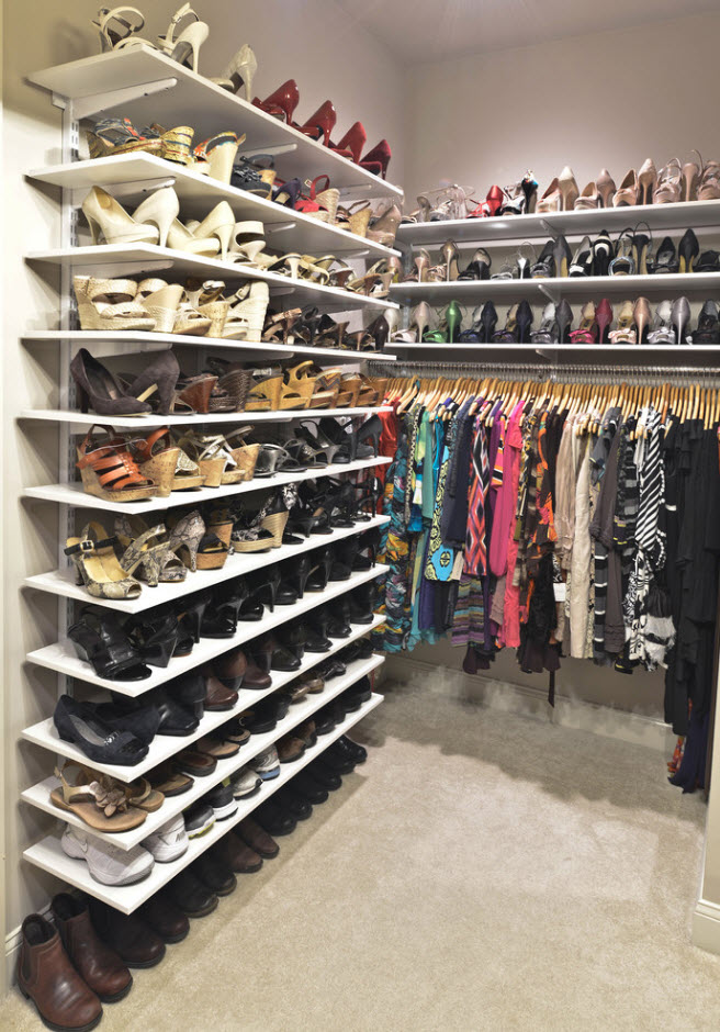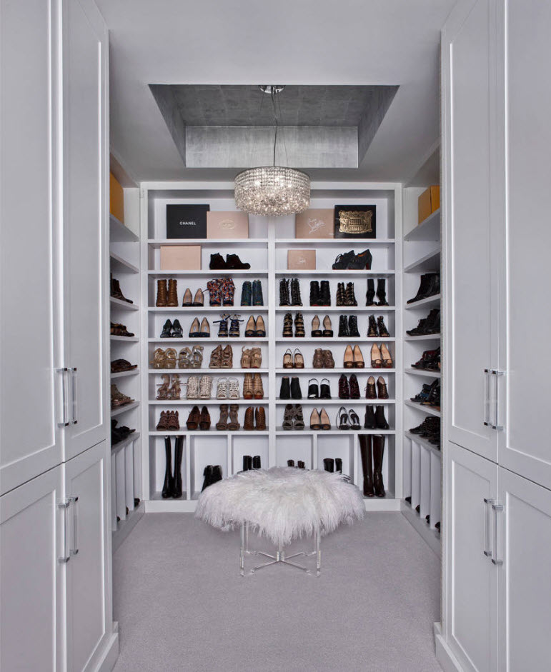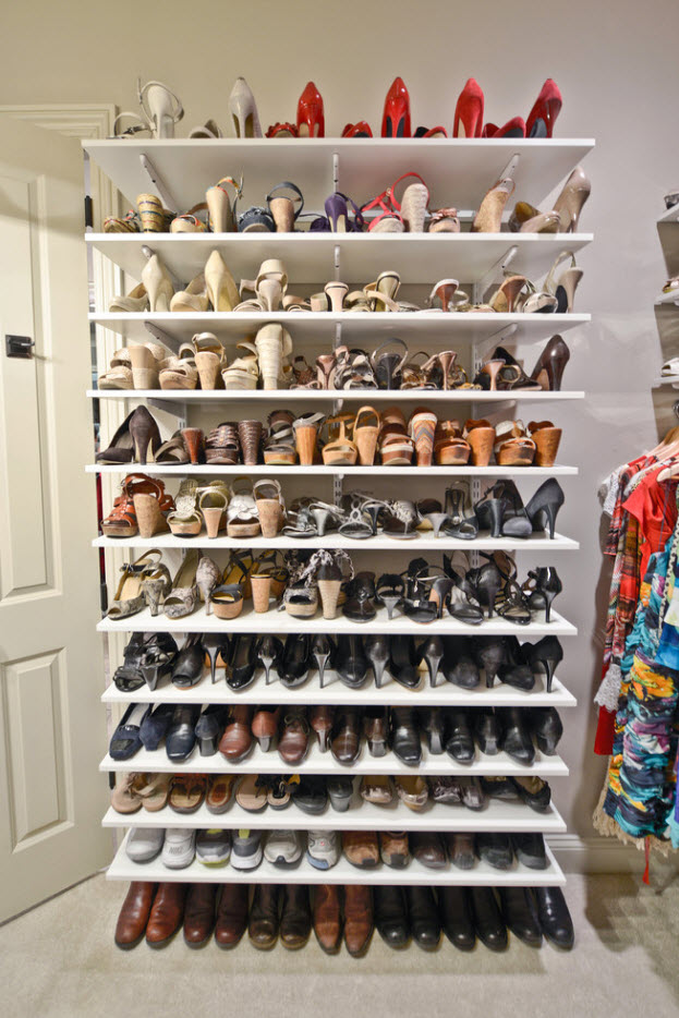Если вы счастливый обладатель просторного жилища, в котором есть возможность выделения отдельного помещения под гардеробную, то проблем с расположением полок для обуви не будет. В зависимости от масштабов вашего обувного «склада» можно расположить полки вдоль одно из стен (длинной или короткой – зависит от формы и размеров помещения). В любом случае, для обуви подходят неглубокие полки, которые не занимают много места в пространстве.