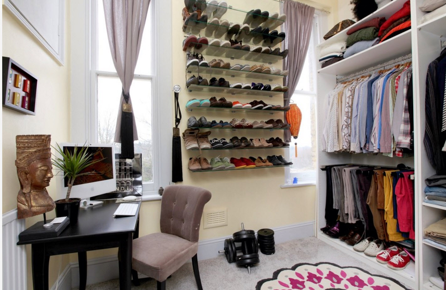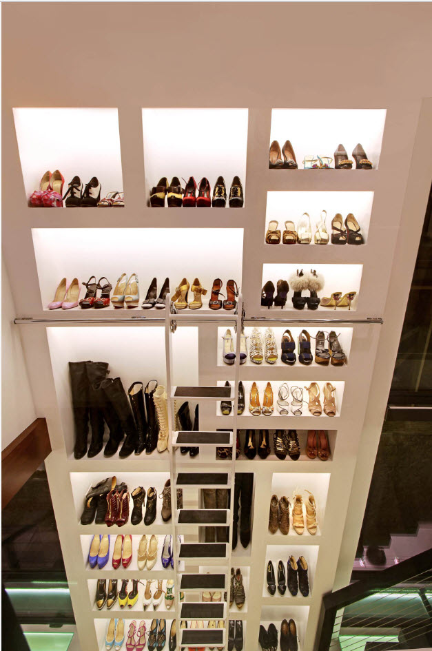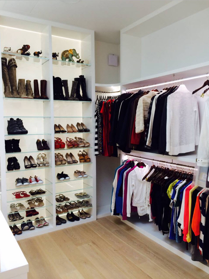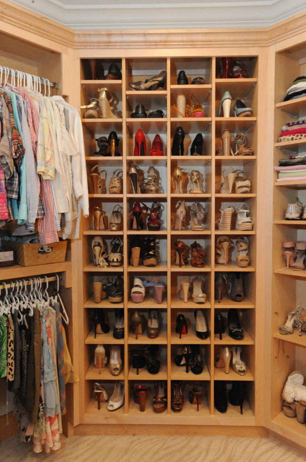 Если вы счастливый обладатель просторного жилища, в котором есть возможность выделения отдельного помещения под гардеробную, то проблем с расположением полок для обуви не будет. В зависимости от масштабов вашего обувного «склада» можно расположить полки вдоль одно из стен (длинной или короткой – зависит от формы и размеров помещения). В любом случае, для обуви подходят неглубокие полки, которые не занимают много места в пространстве.