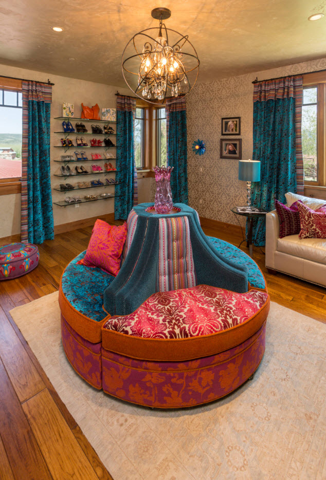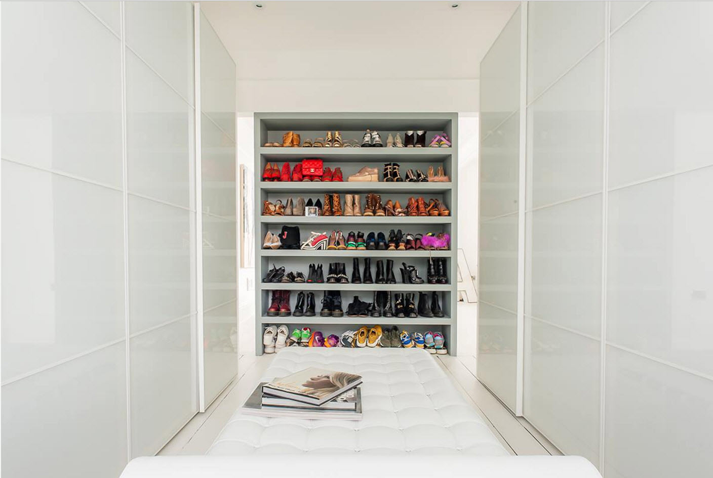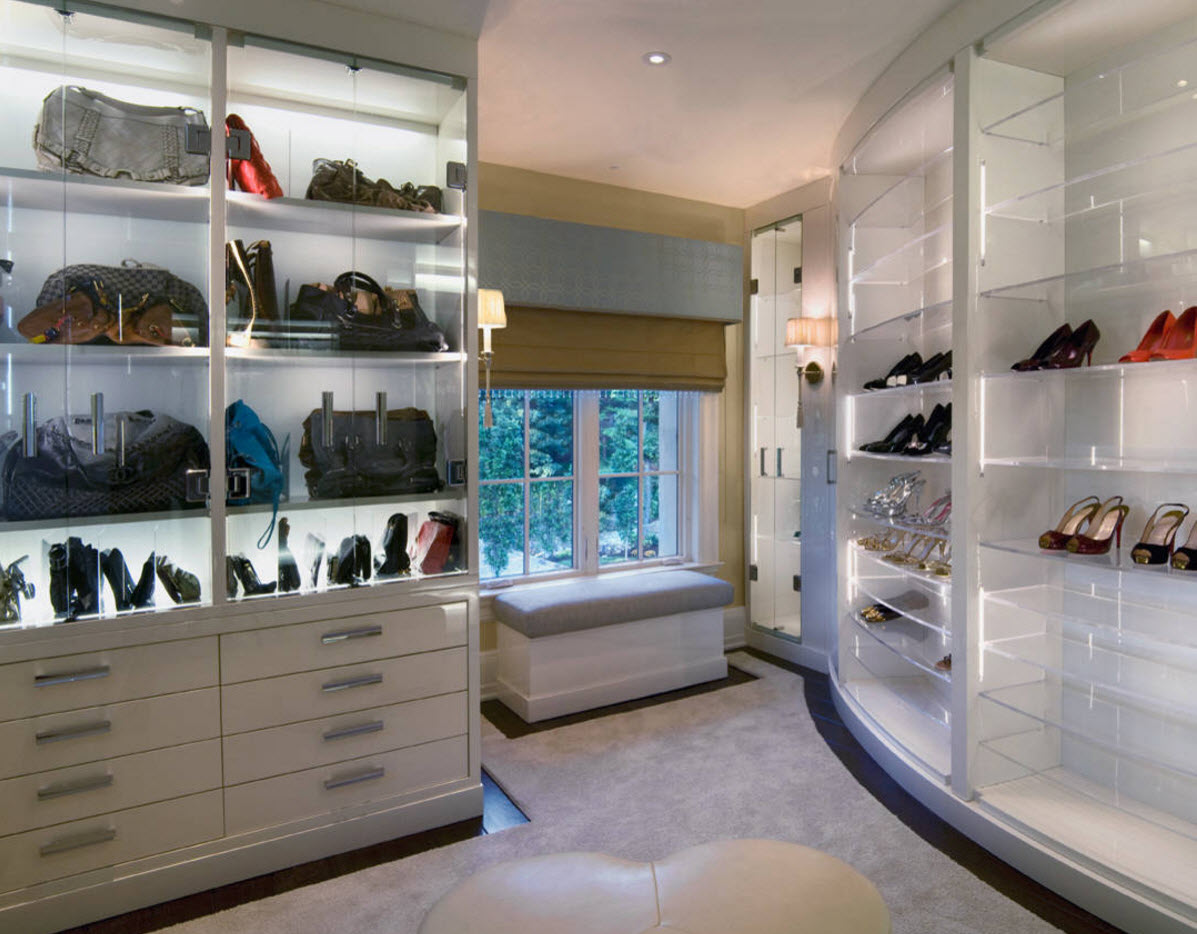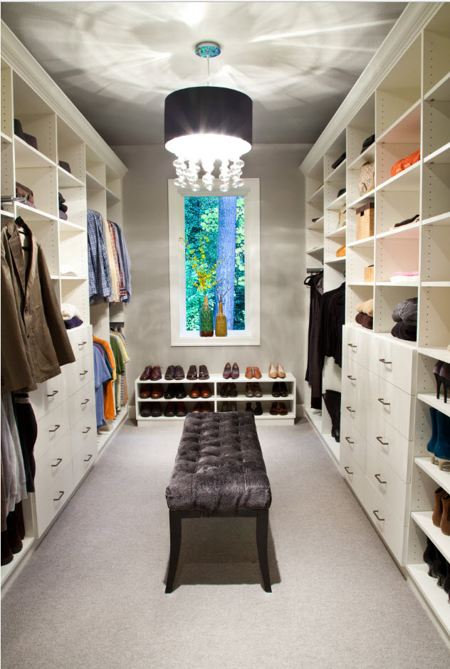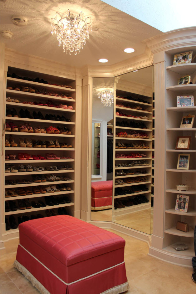 Еще один оригинальный и при этом практичный способ расположения обувных полок – под мягким сиденьем вместительного острова, который устанавливается в центре гардеробной. Вам будет удобно не только хранить обувь, но и примерять ее.