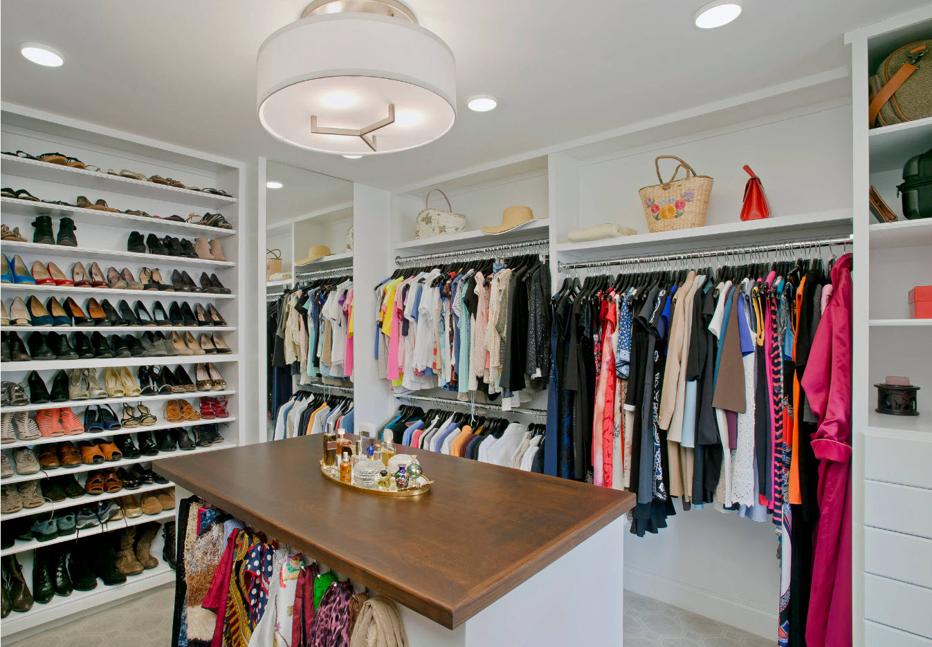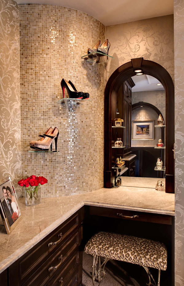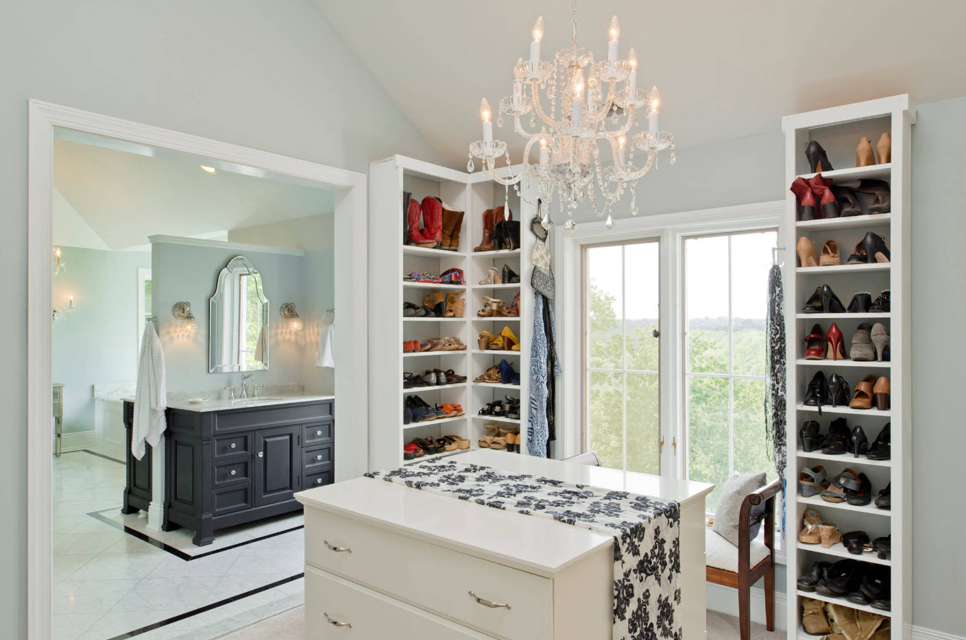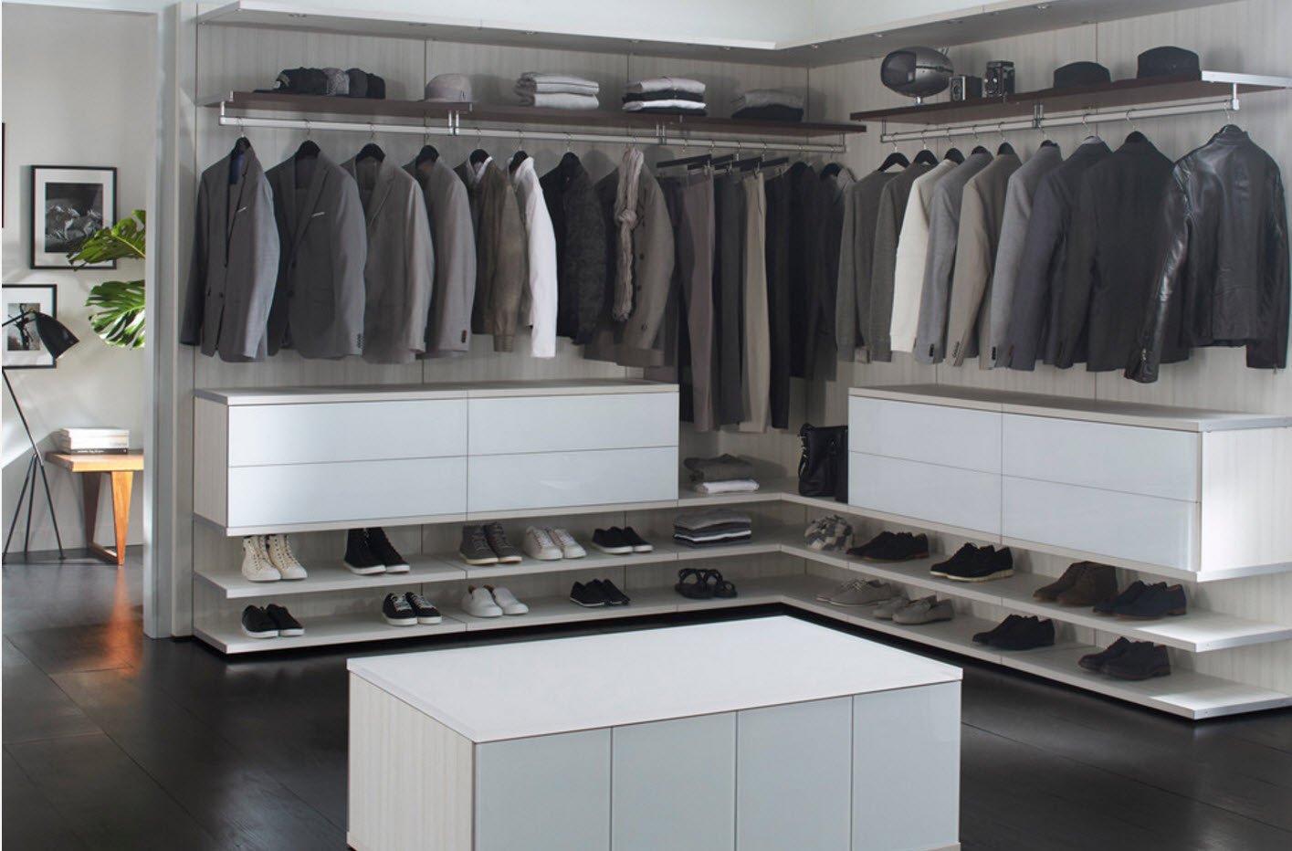 Еще один оригинальный и при этом практичный способ расположения обувных полок – под мягким сиденьем вместительного острова, который устанавливается в центре гардеробной. Вам будет удобно не только хранить обувь, но и примерять ее.