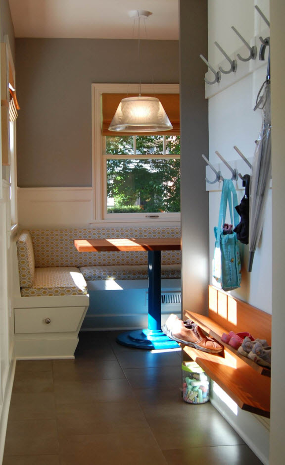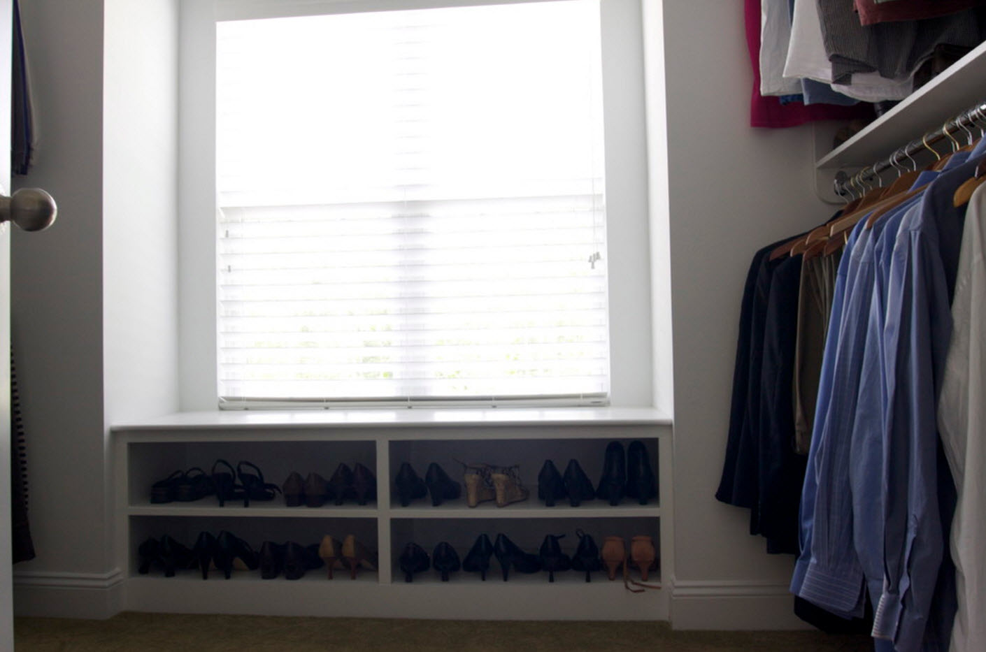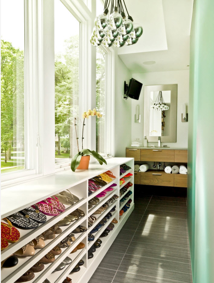 Использование пространства под окном или по оби стороны от оконных и дверных проемов поможет не только организовать удобную и рациональную систему для хранения обуви, но и сэкономить полезное пространство помещения.