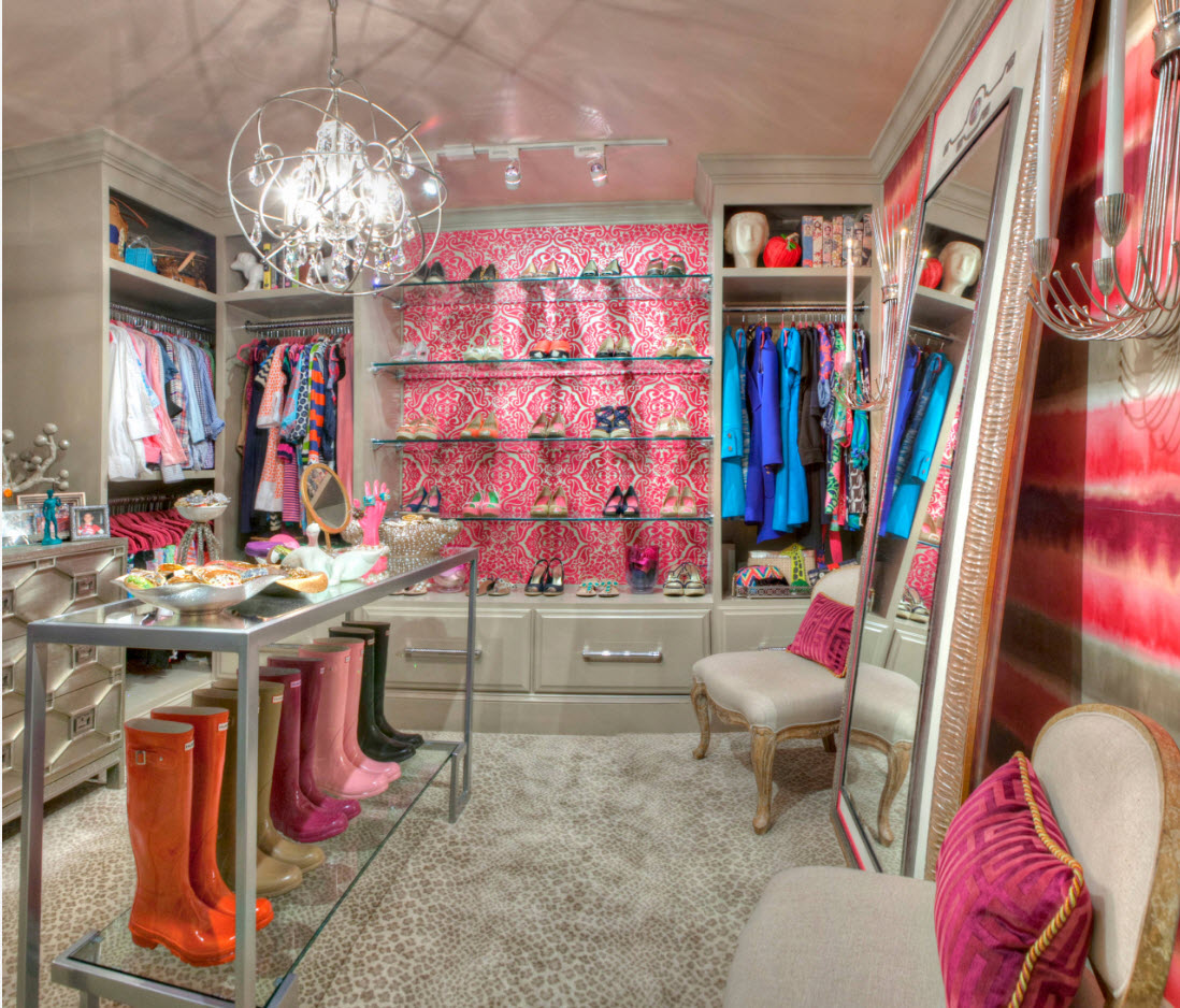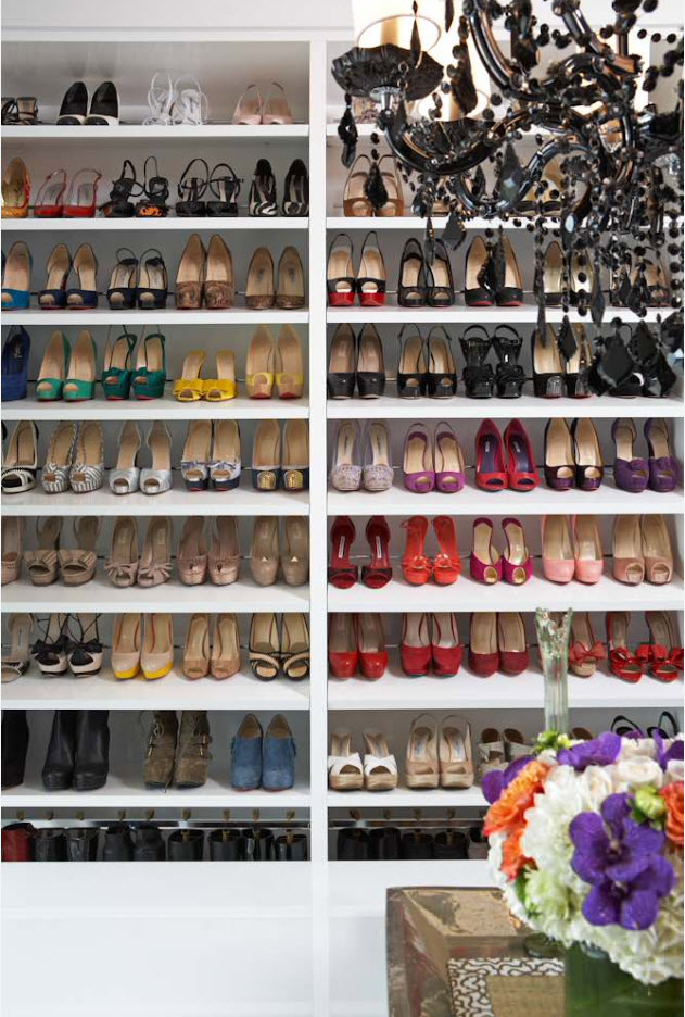 Если вам хочется привнести нотки яркости в оформление гардеробной или любого другого пространства, в котором находятся системы хранения – используйте пестрый фон для открытых полок. Ваша обувь заслуживает роскошного оформления.