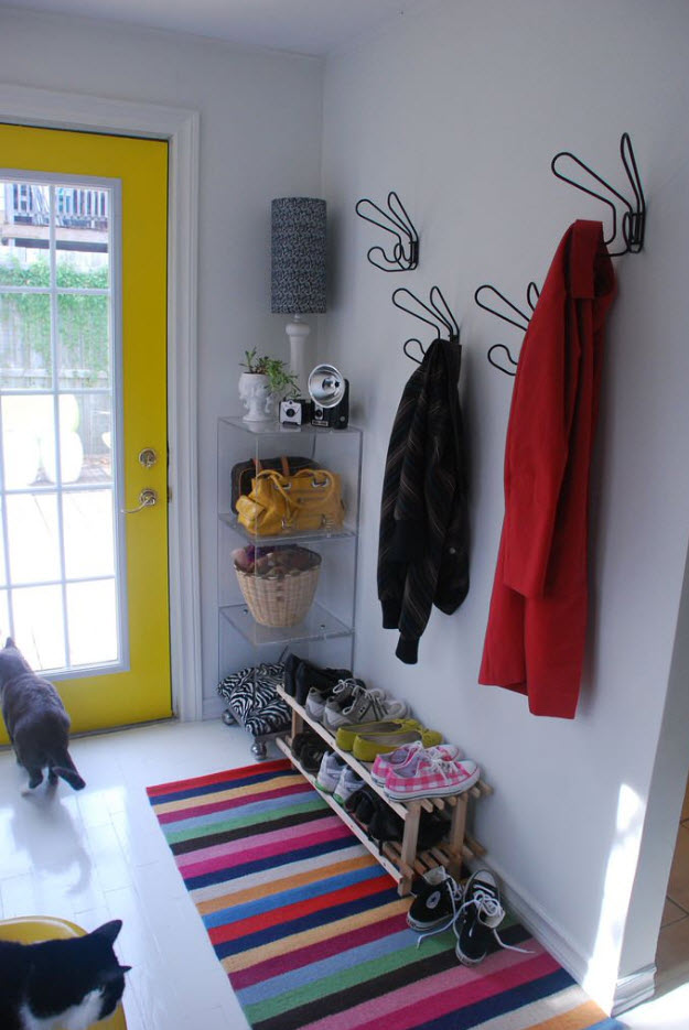 Для организации систем хранения в прихожей отлично подойдут полки с бортиками. Для защиты поверхности от влаги и грязи можно использовать резиновые коврики. Таким образом вы и чистоту полок сохраните и избавите себя от необходимости полностью очищать обувь перед тем как поместить ее на поверхность систем хранения.