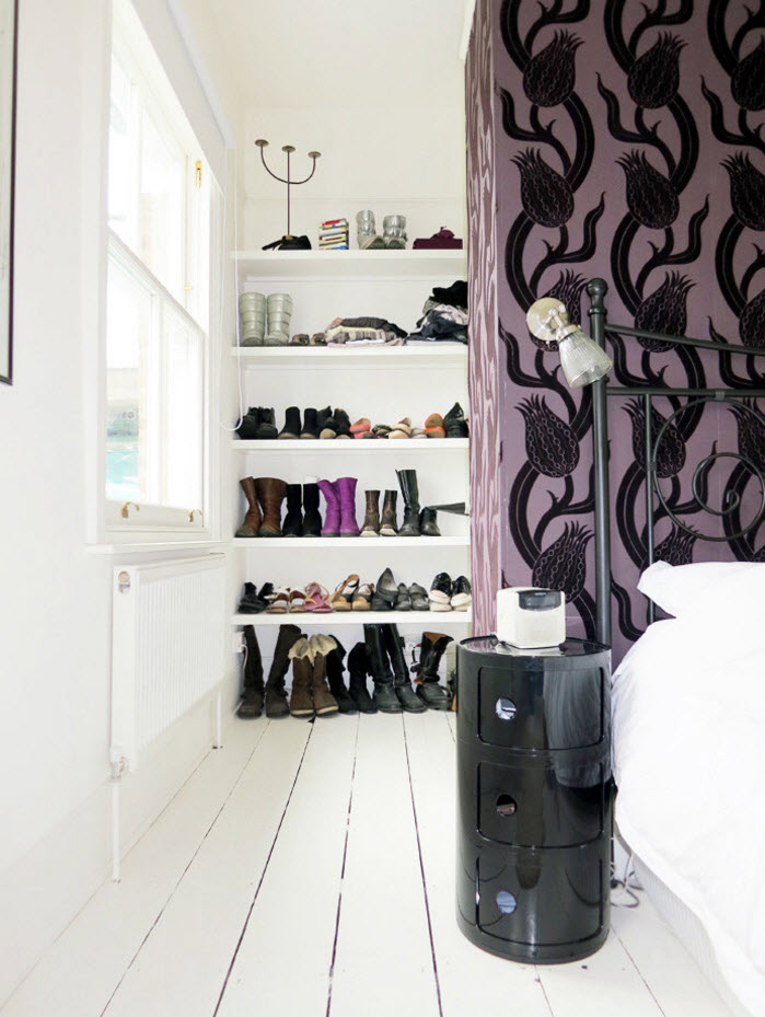 В просторной спальне можно использовать перегородку (например, разделяющую спальную зону и рабочую) под обустройство стеллажа с полками для обуви. Экономия пространства и удобство использования систем хранения вам обеспечены.