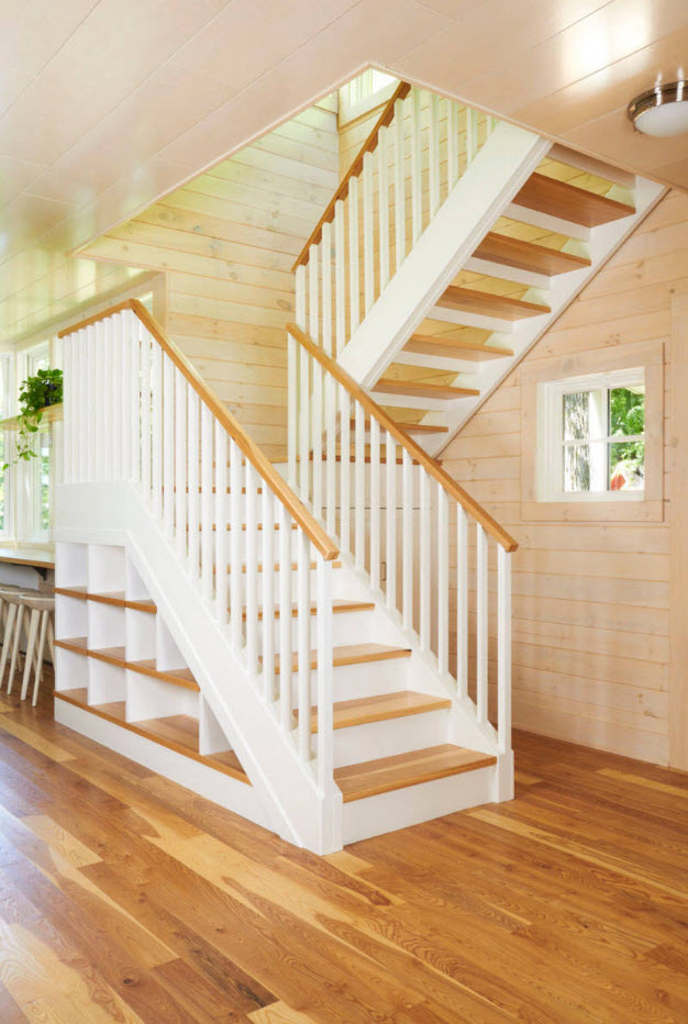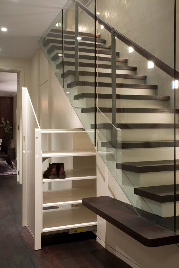 Использование пространства вокруг лестницы (чаще всего под нею) – особое искусство получения дополнительного пространства для организации систем хранения. Если с обустройством выдвижных или встроенных полок под лестницей все более или менее понятно, то использование лестничных маршей, площадок между этажами и стоек винтовых конструкций – удел профессионалов, которые помогут вам организовать упорядоченную систему хранения в тех местах, о которых вы даже не думала в качестве полезных квадратных метров.